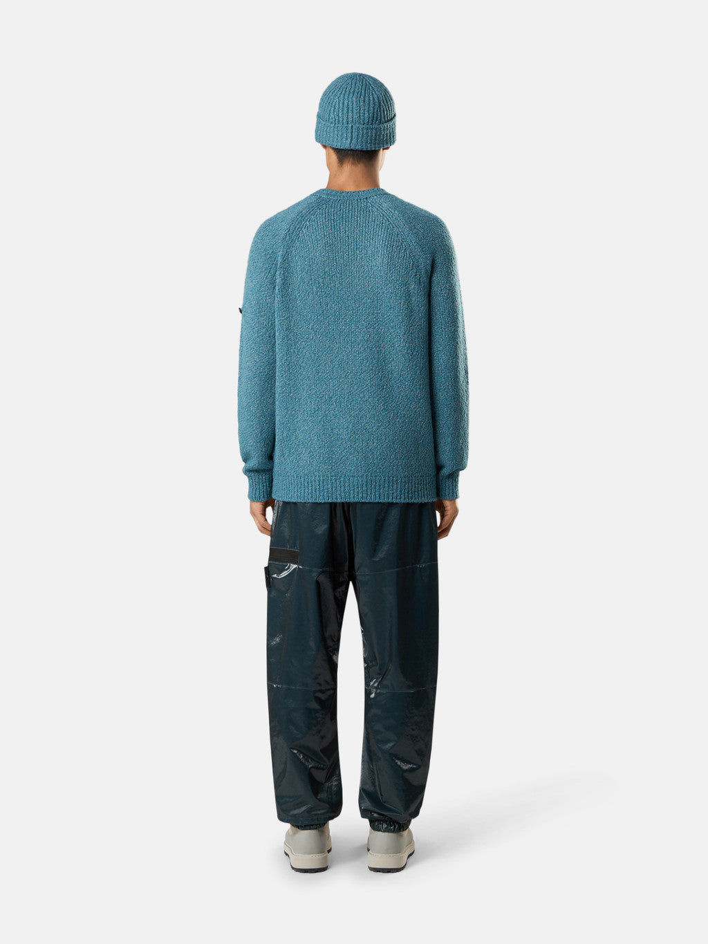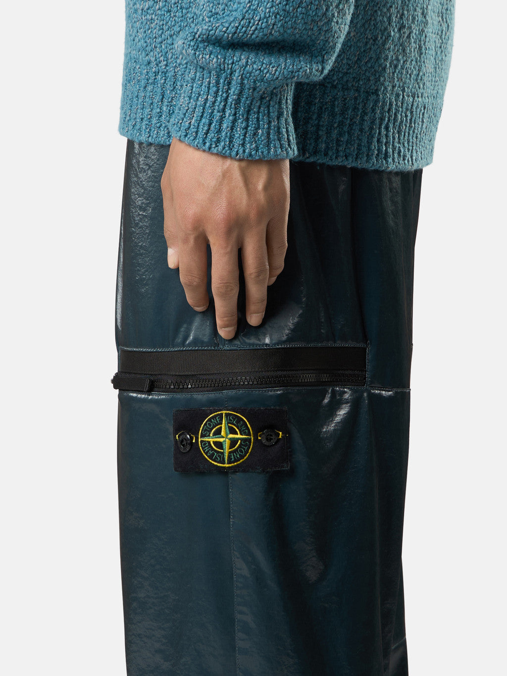 Joggers made from a stretch nylon, laminated on the outside with a transparent polyurethane film that makes the fabric resistant to wind. The coating renders the surface smooth and shiny. Garment dyed.