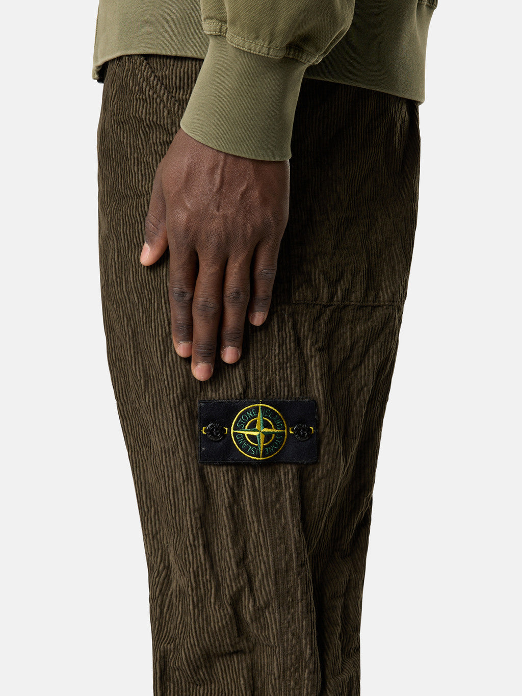Trousers in cotton-nylon corduroy 500. The weave is made with a monofilament nylon that lends a springy hand and a wrinkled appearance to the fabric. Garment dyed.