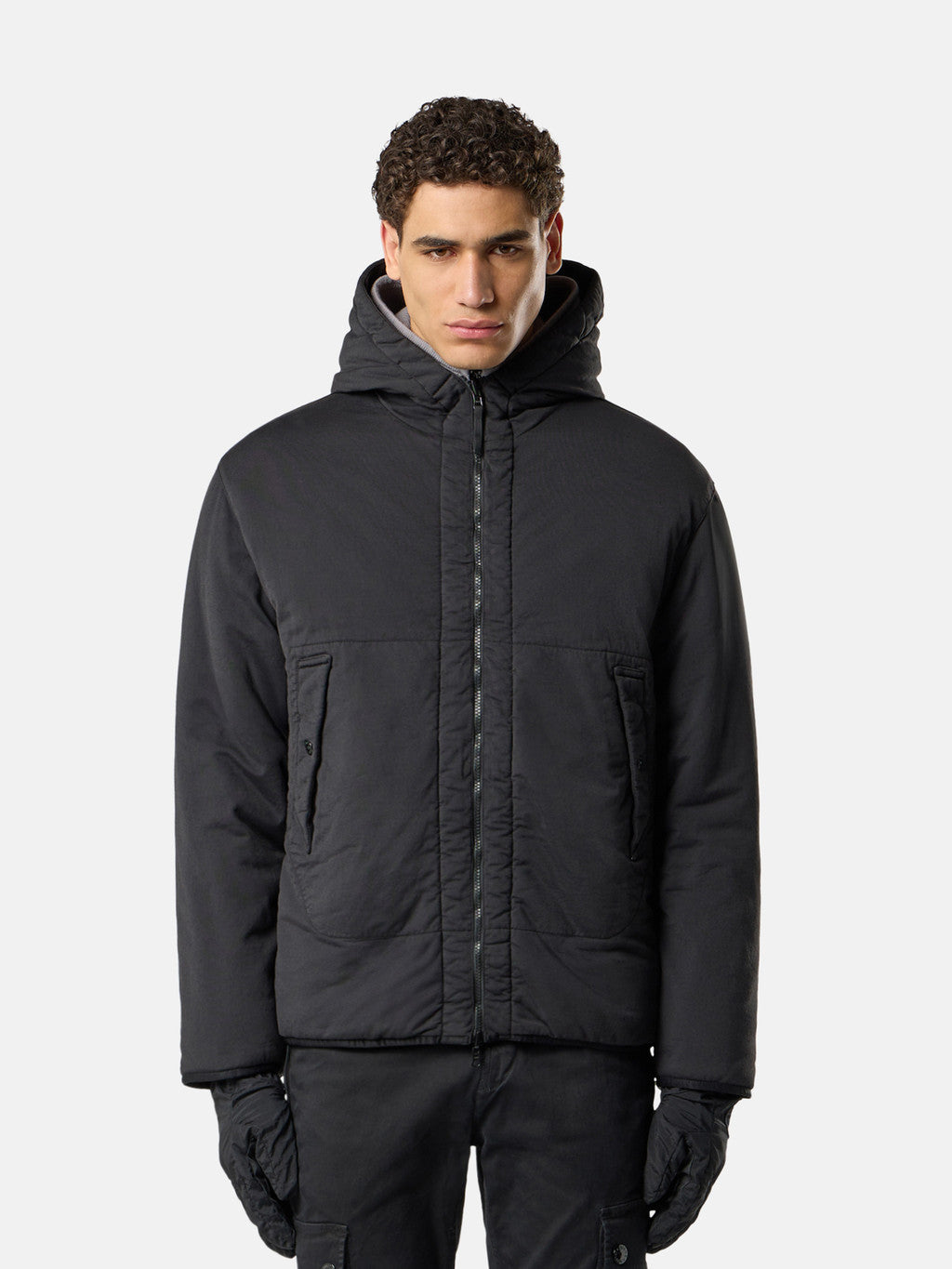 Reversible hooded jacket. On one side, compact jersey composed of mako cotton and nylon and on the other, nylon coated with a glossy polyurethane resin. Garment dyed with a double colour recipe.
