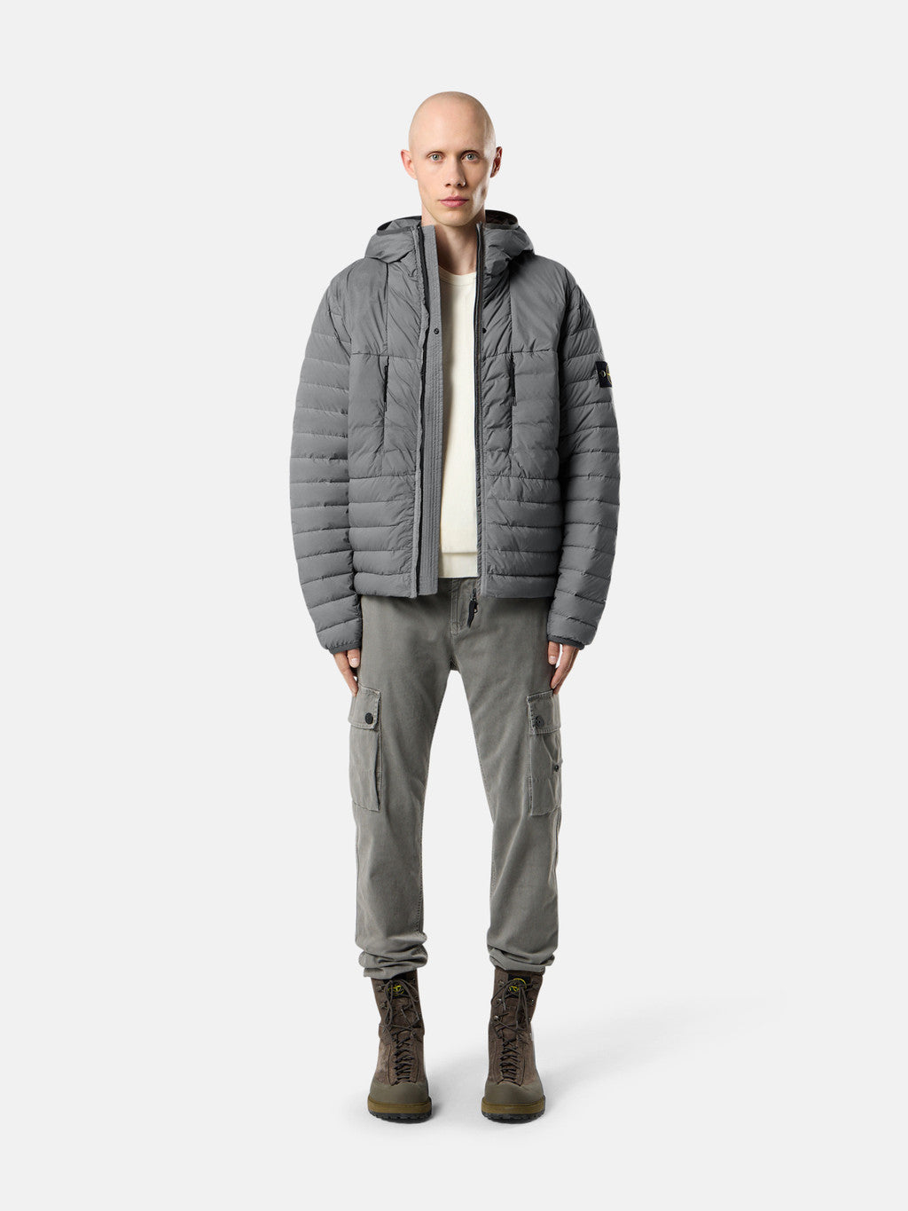Hooded down jacket in a light single layer stretch fabric made with 86% recycled nylon that undergoes a special weaving technique automatically creating the feather compartments directly from the loom. The seamless feather tunnels substantially increase the hold of the down. The finished garment is padded with direct injection with the finest feathers, specifically treated to resist garment dyeing. Garment dyed with the addition of a special anti-drop agent. RDS - Responsible Down Standard certified.