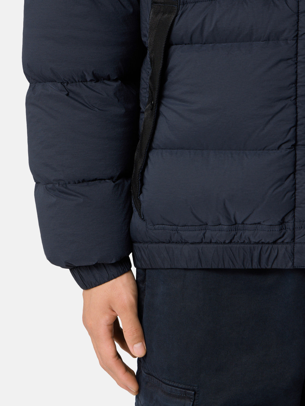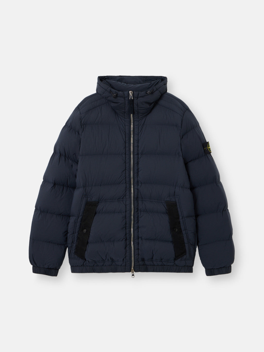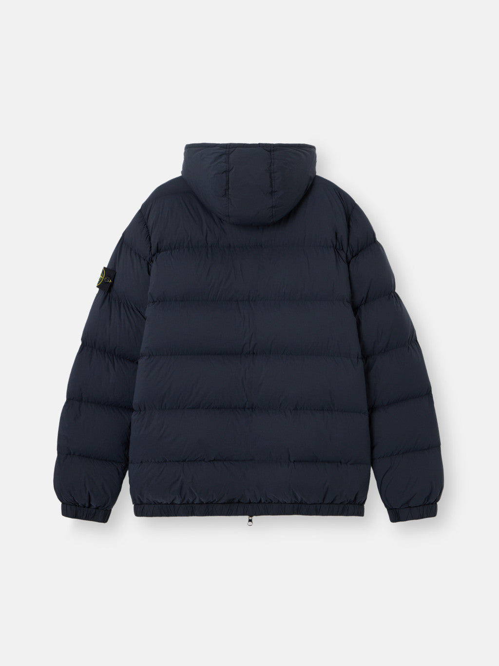 Hooded down jacket in a light stretch nylon single layer fabric undergoing a special weaving technique automatically creating the feather compartments directly from the loom. The seamless feather tunnels substantially increase the hold of the down. The finished garment is padded with direct injection with the finest feathers, specifically treated to resist garment dyeing. Garment dyed with the addition of a special anti-drop agent. RDS - Responsible Down Standard certified.