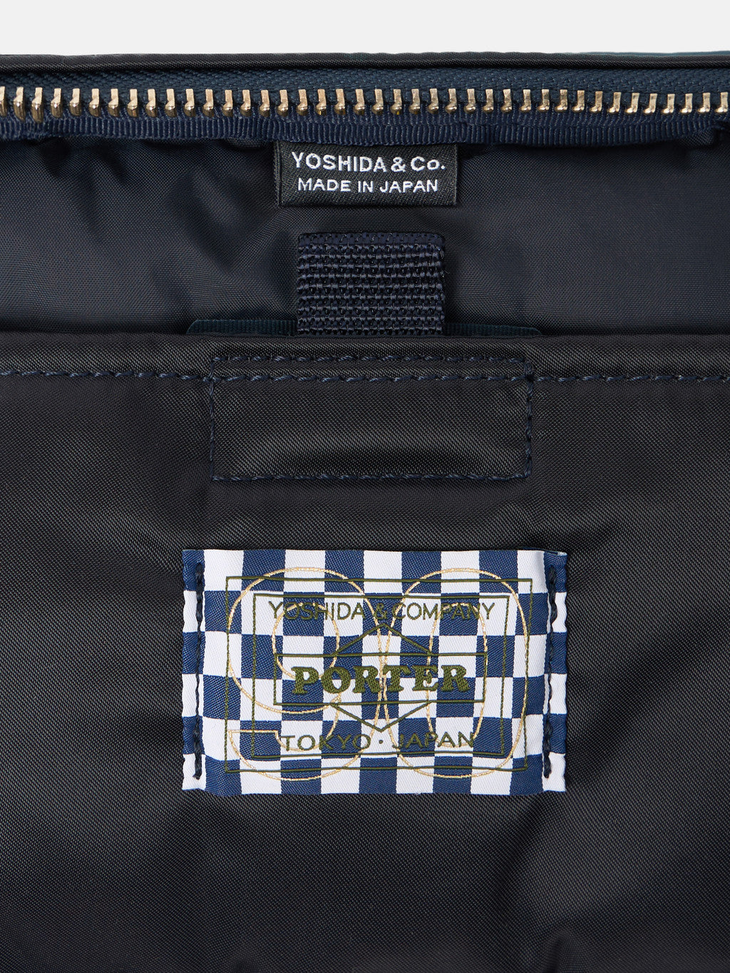 Cross body bag made from blue nylon twill. The finished garment undergoes an innovative corrosion treatment on nylon, reflecting Stone Island's ongoing commitment to research and experimentation. The corrosive solution is sprayed manually through an artisanal process, making each piece unique and unrepeatable. The corroded areas take on a worn appearance, creating a gradient effect. The garment is then washed to halt the corrosion process.
