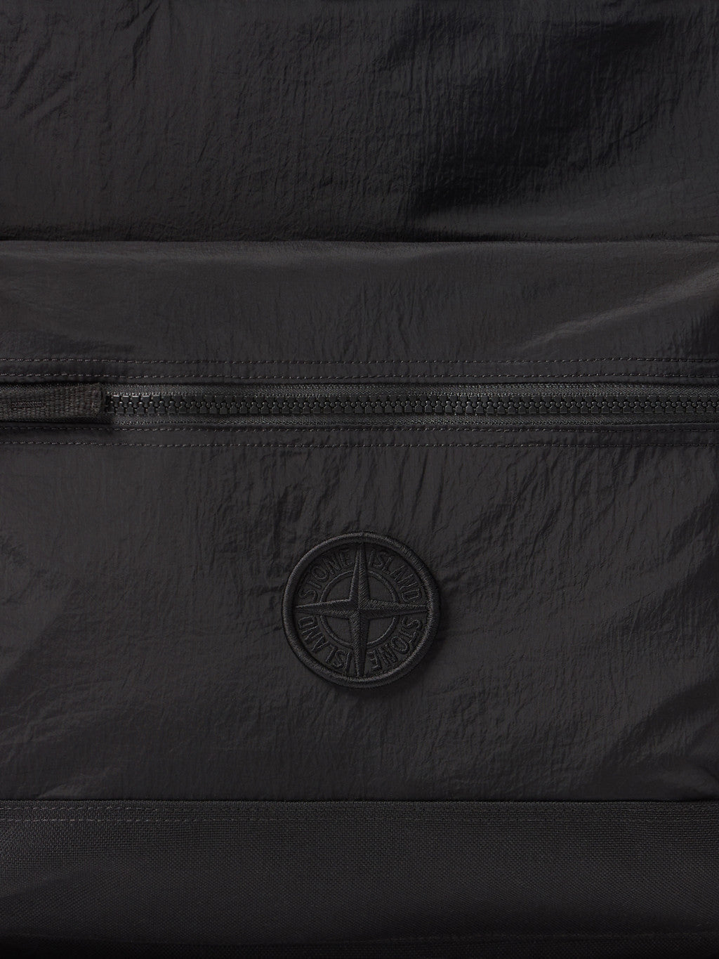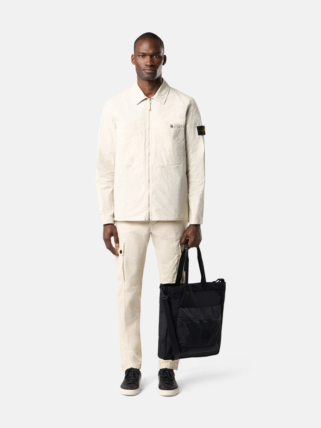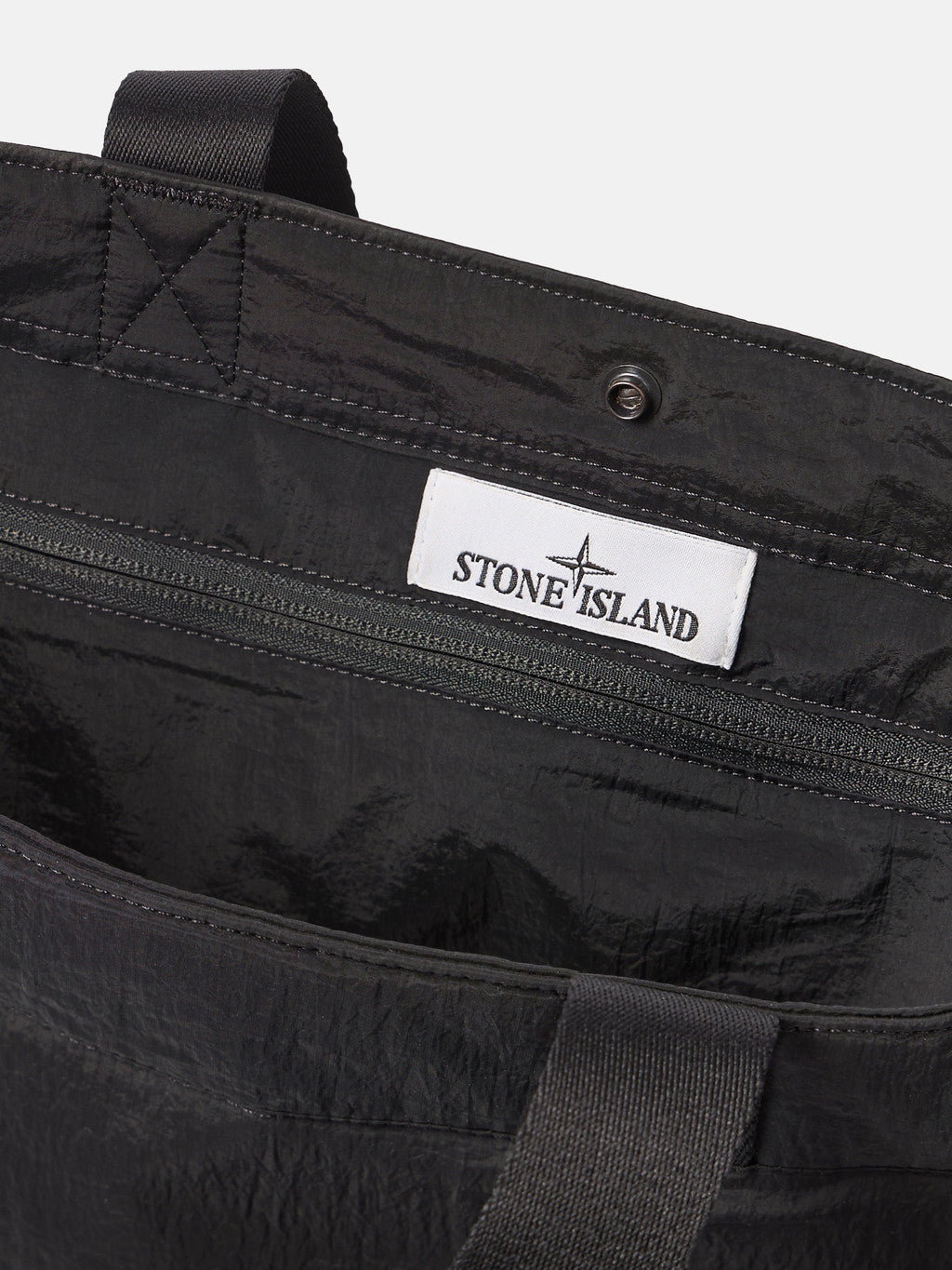 Tote bag made in the responsible Stone Island iridescent Nylon Metal fabric. The evolution of this iconic fabric sees the use of ECONYL regenerated yarns: the life ended nylon, pre and post-consumer, is recycled with a complex depolymerization process to create this fibre that features the same intrinsic characteristics of nylon from fossil raw material.
