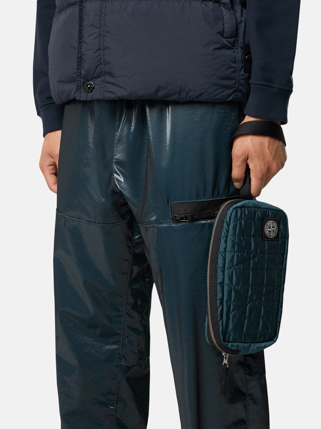 Wrist pouch in Stone Island's iridescent Nylon Metal fabric with polyurethane coating. The evolution of this iconic fabric sees the use of ECONYL regenerated yarns: the life ended nylon, pre- and post-consumer, is recycled with a complex depolymerization process to create this fibre that features the same intrinsic characteristics of nylon from fossil raw material.