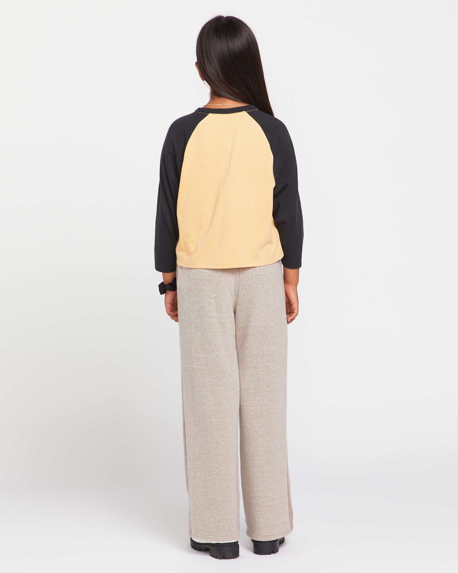 - Long sleeve raglan with color blocked sleeves and neck binding