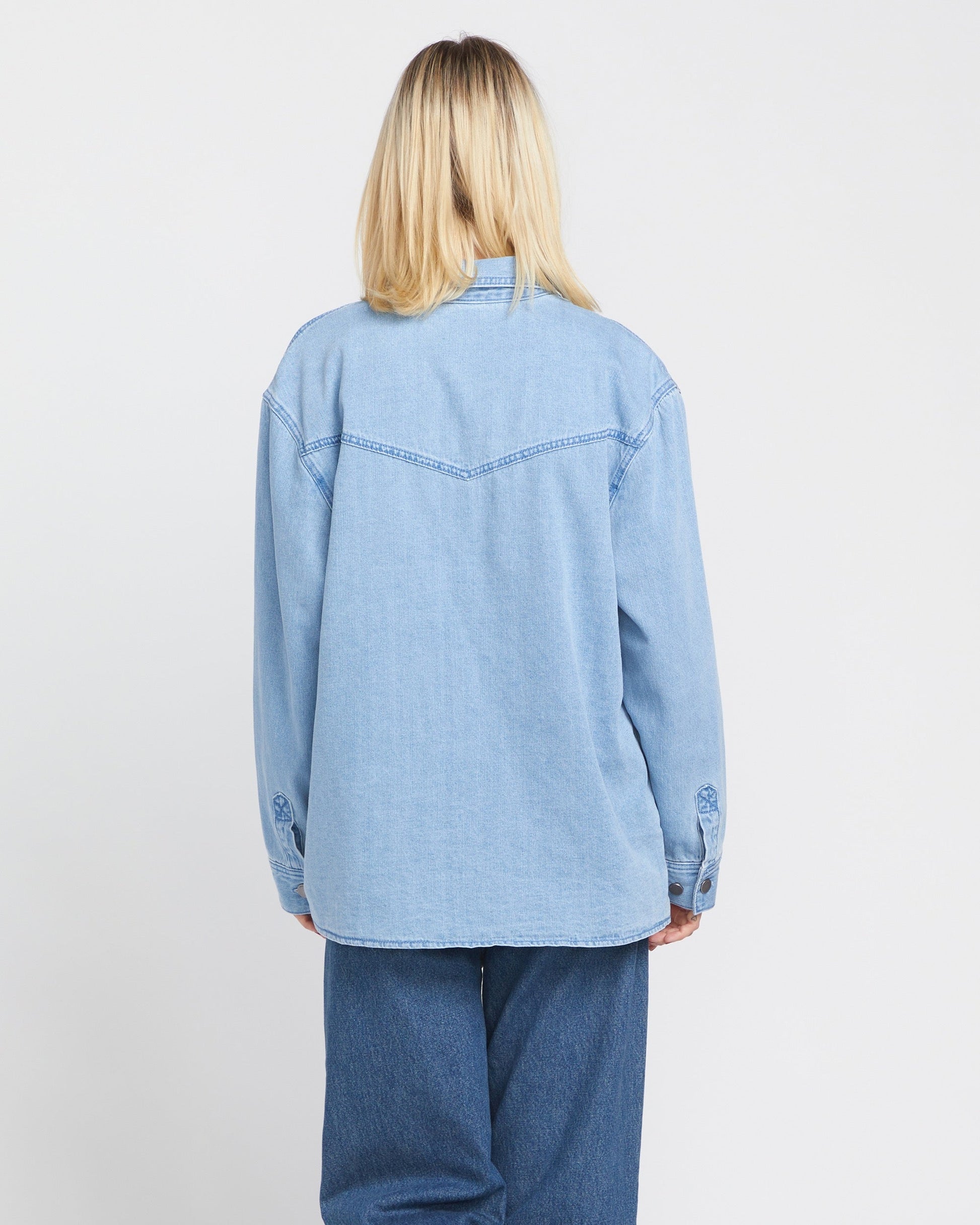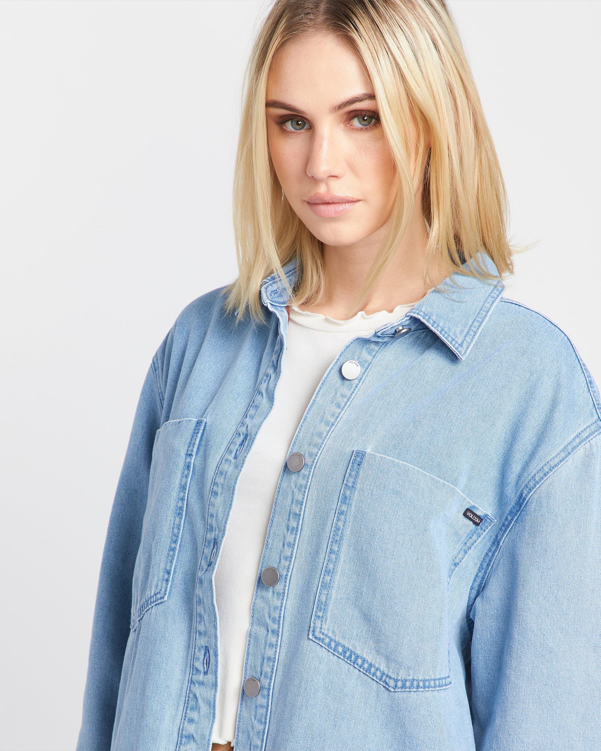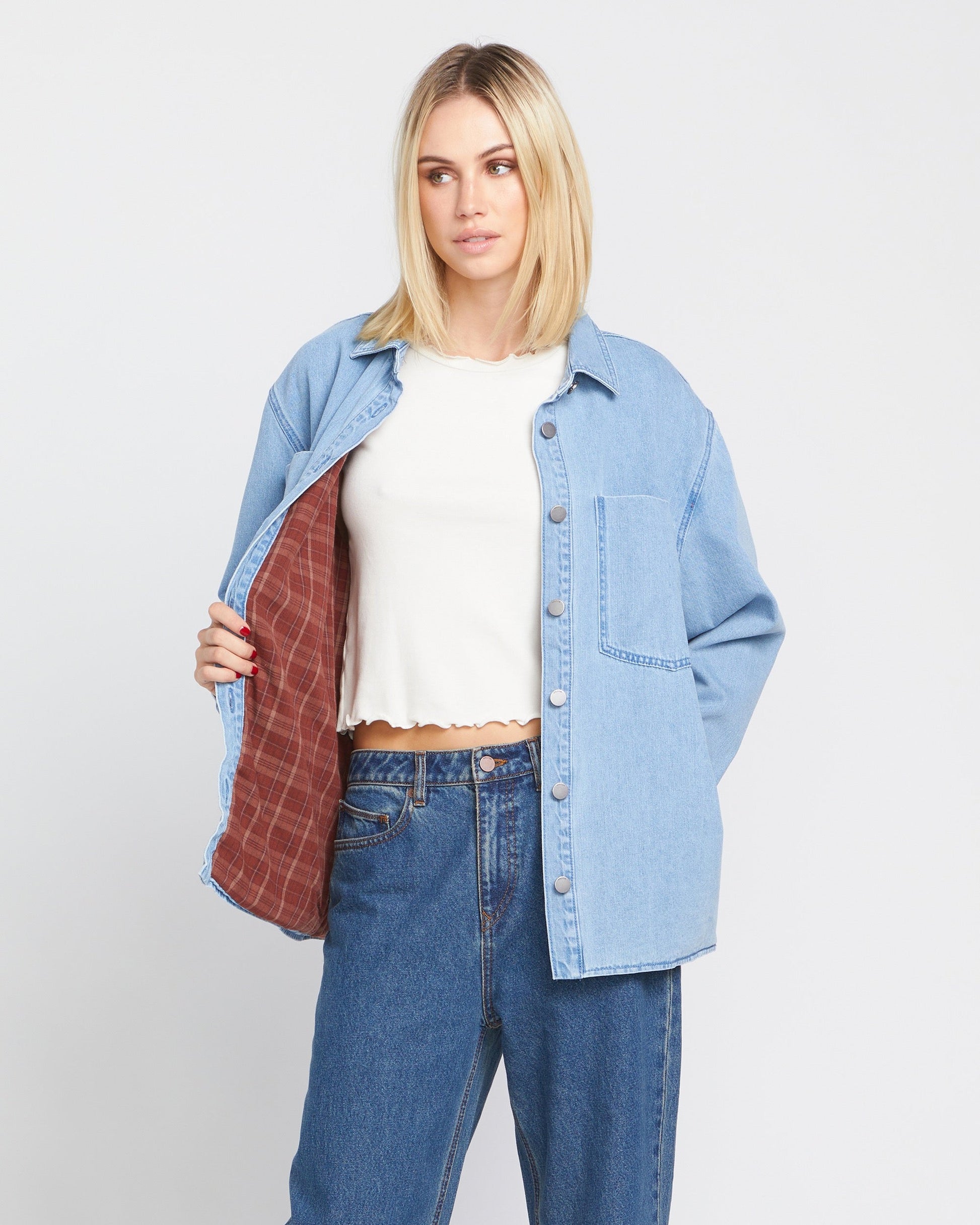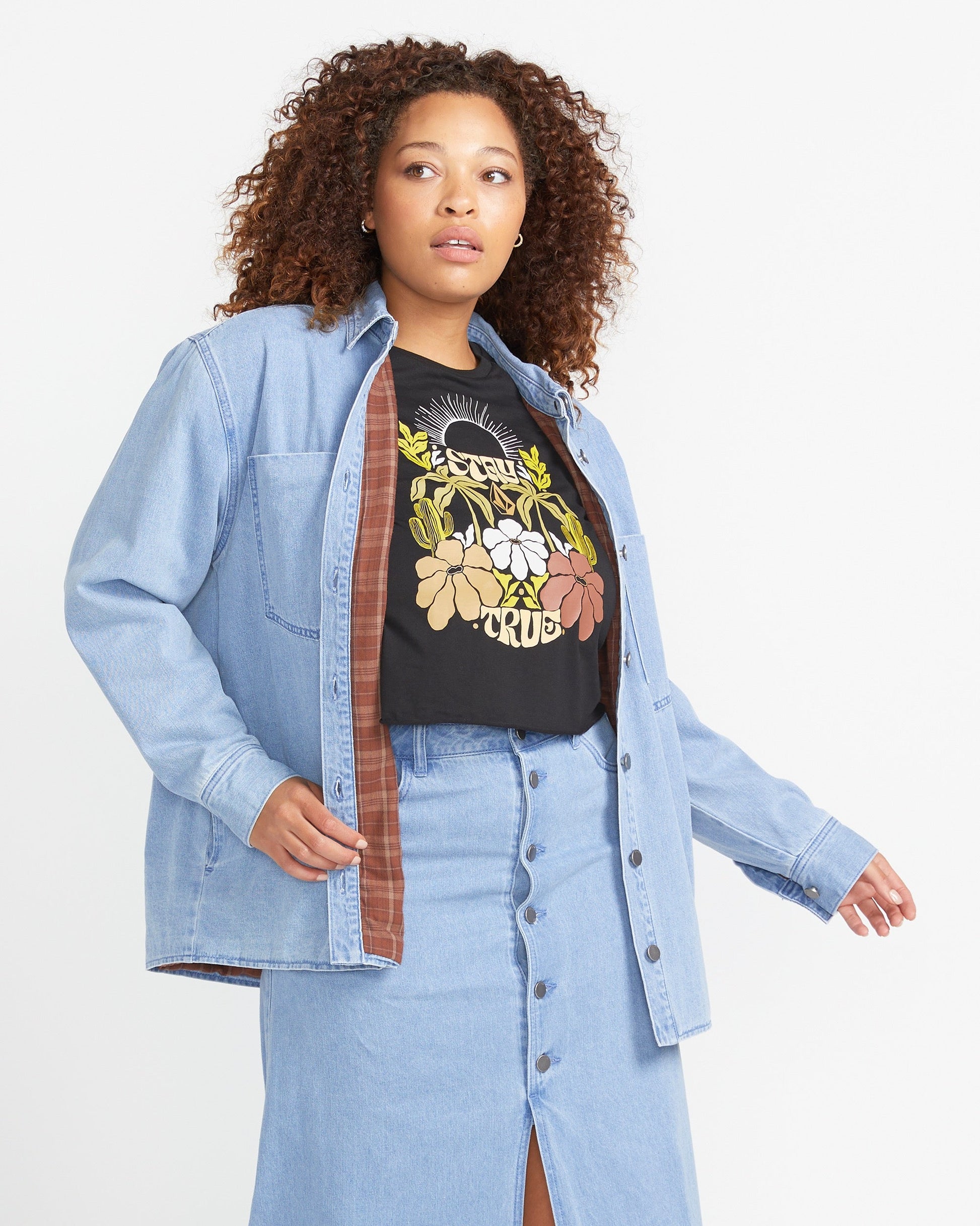This oversized denim wonder features a plaid flannel lining to keep you cozy, while large chest pockets provide ample storage for your everyday essentials, and a dropped back yoke adds a touch of edge. Slip this denim shacket on when you want to warm up and chill out. Featured here in blue.