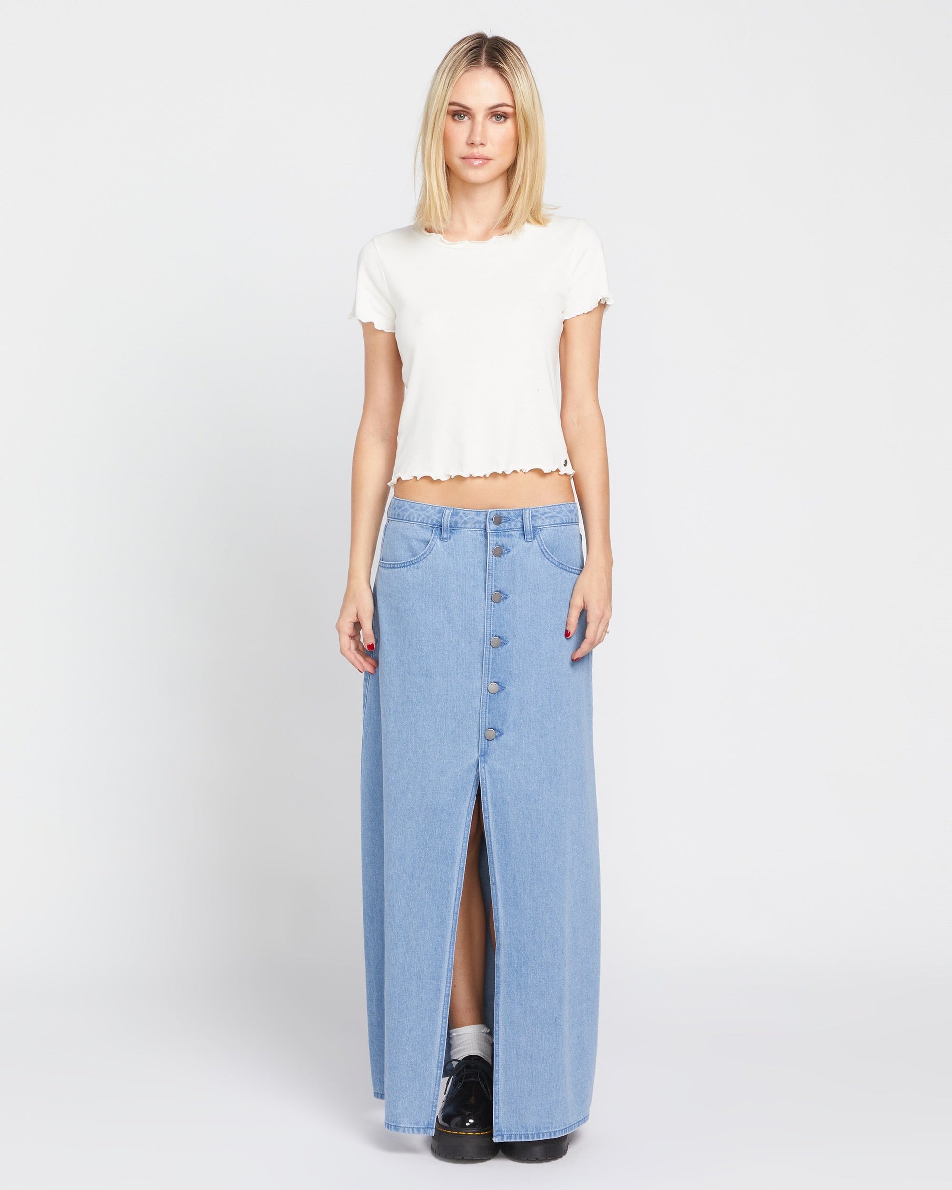• Low rise denim column maxi skirt with front shank button hardware closure over center front slit