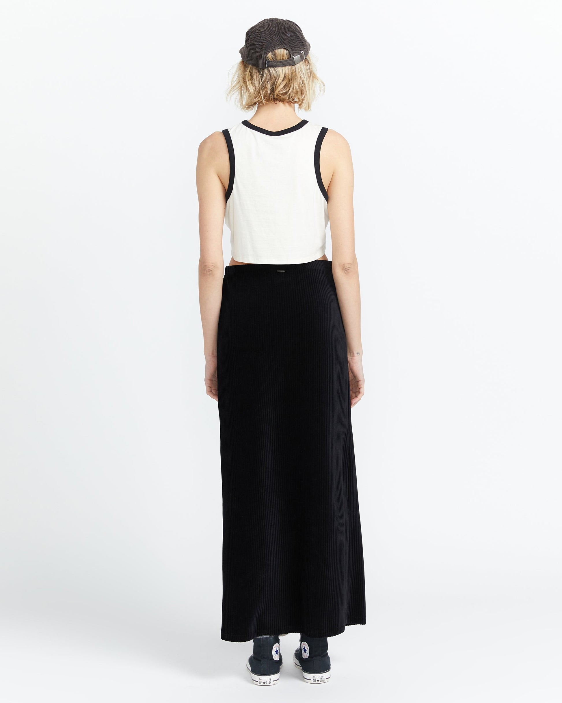 Slip this maxi skirt on and slide right into stylish comfort. The soft corduroy velour fabric and stretchy pull-on waistband make it perfect for lounging or casual outings. With its flattering A-line shape and versatile 38" length, this skirt effortlessly transitions from day to night. A metal badge adds a subtle designer touch. Featured here in black.