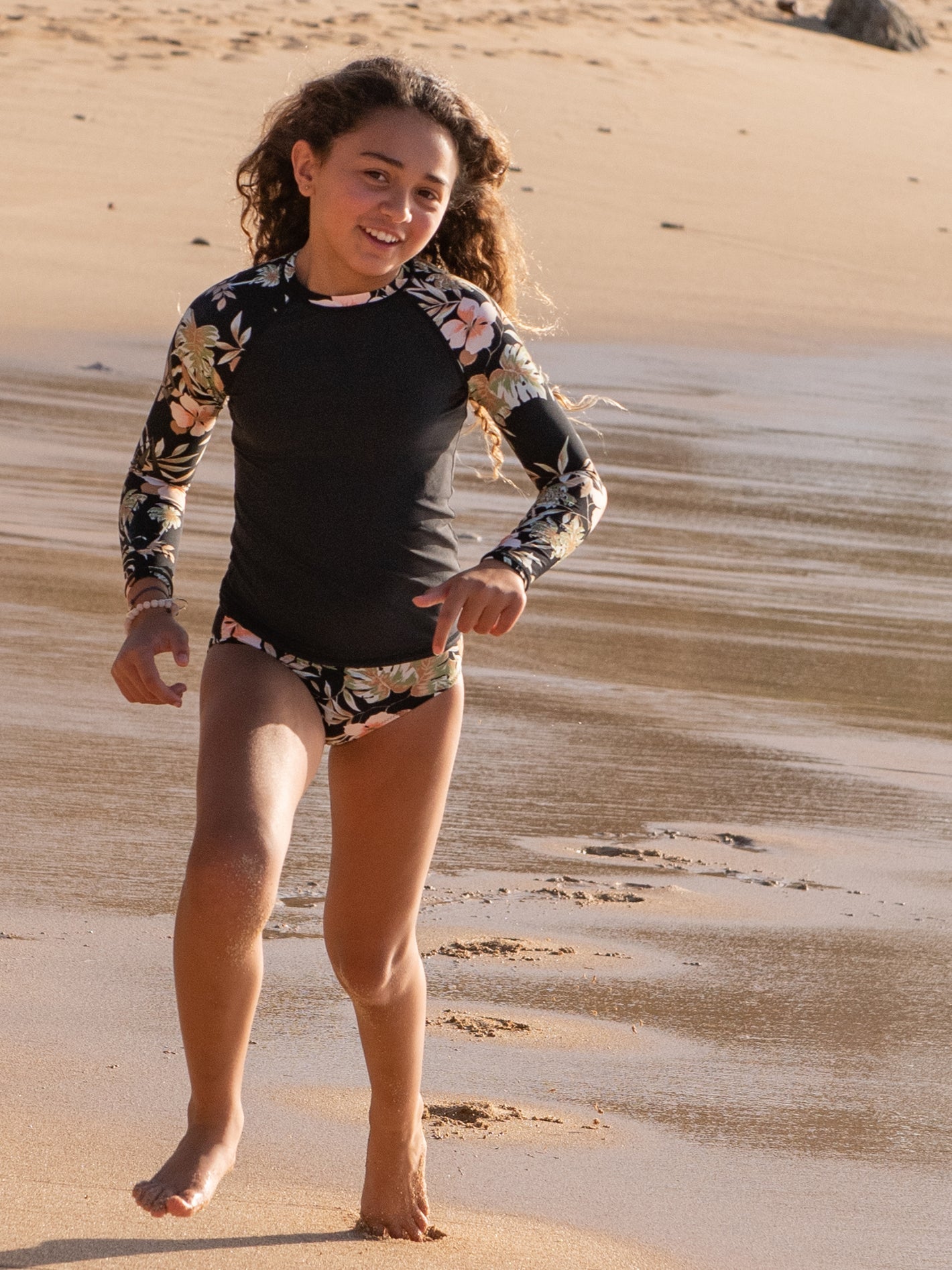 - Pull over long sleeve raglan rashguard with contrast printed sleeves