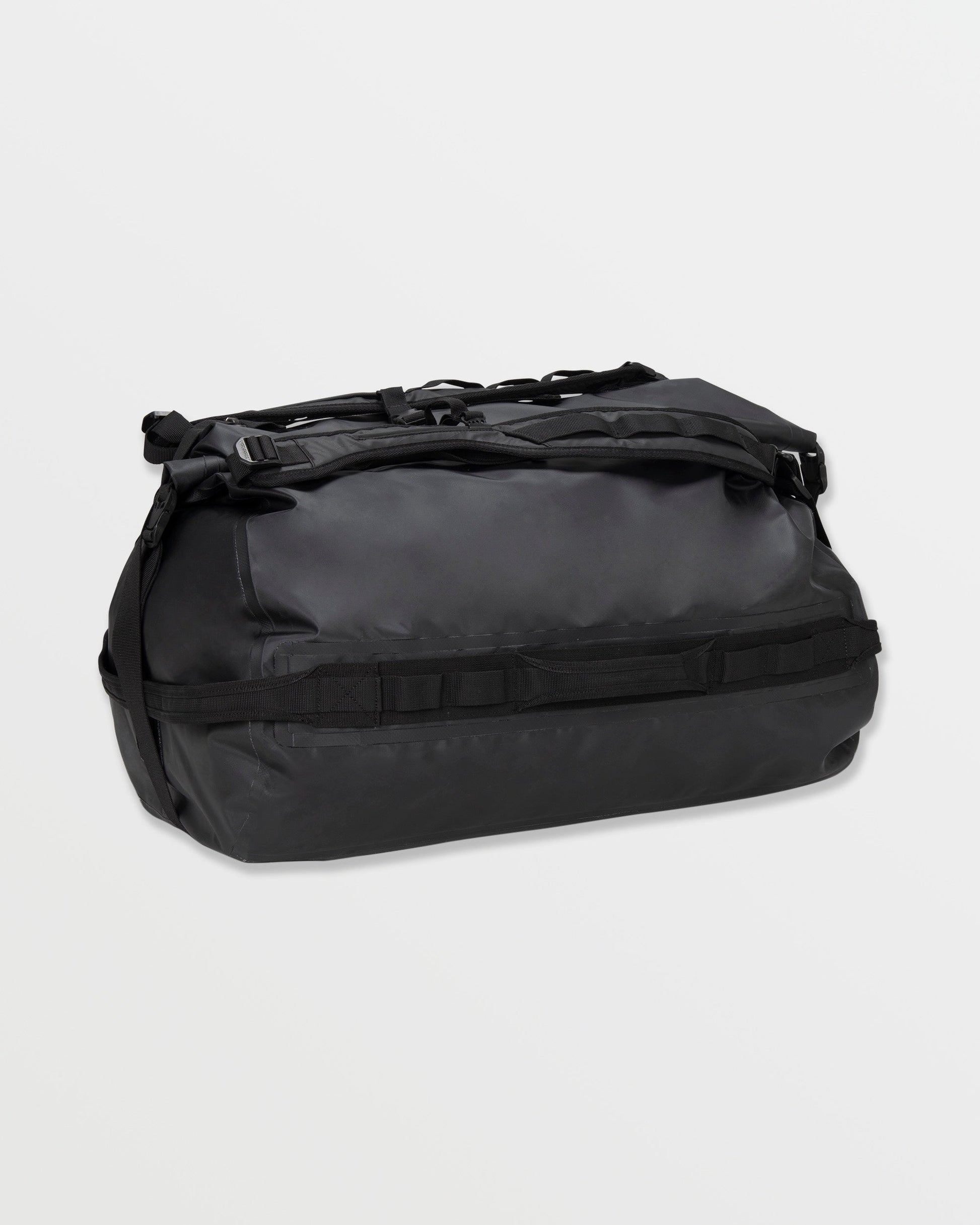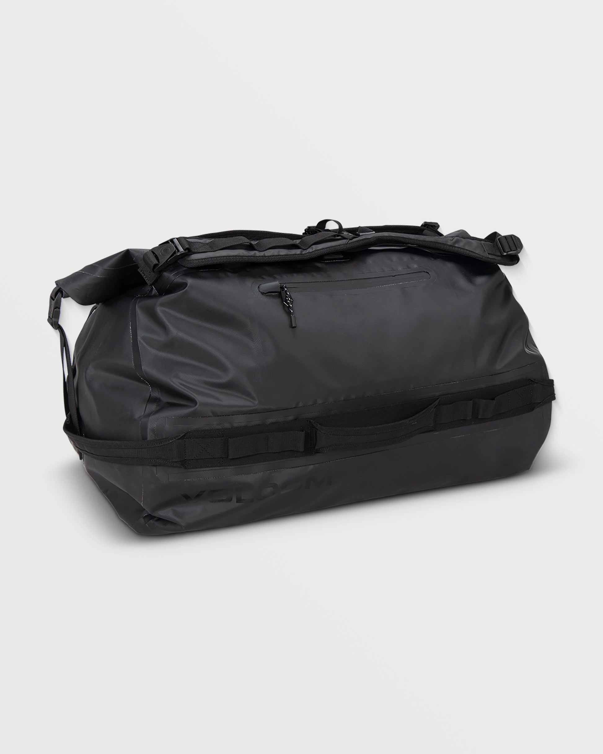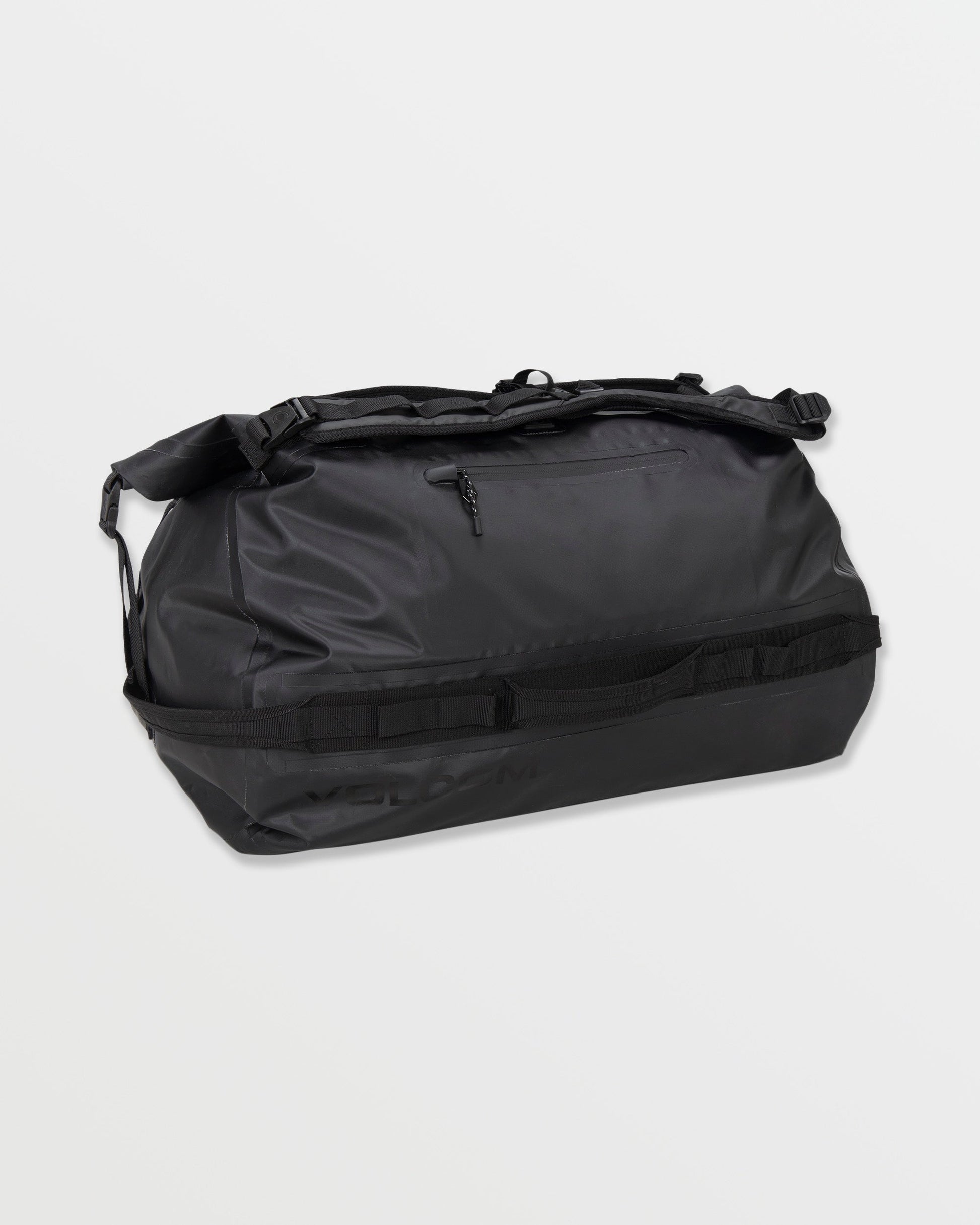 Travel in style with the Frequency Roll-Top Duffel. Made from 100% polyester, this duffel bag features a large main compartment, front zip pocket, convertible shoulder strap carry-handles, side haul handles, and branded release clips. Featured here in black.