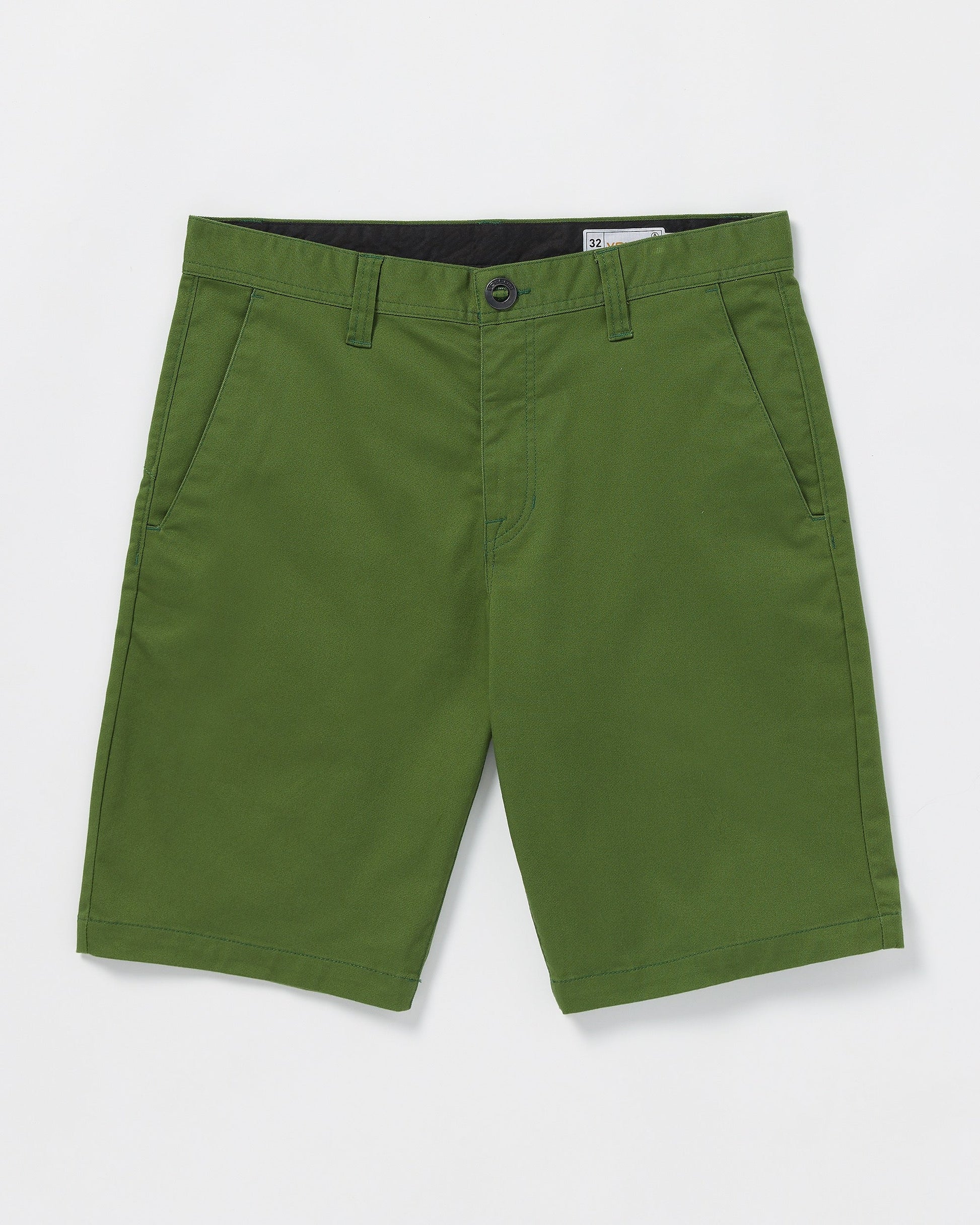 High versatility for all kinds of action. Crafted with a blend of cotton, partially recycled polyester, and elastane, they offer a modern, 5-pocket chino fit with a 21" outseam. The signature asymmetric back yoke and "V" branding add a stylish touch to these pre-laundered, versatile shorts. Featured here in green.