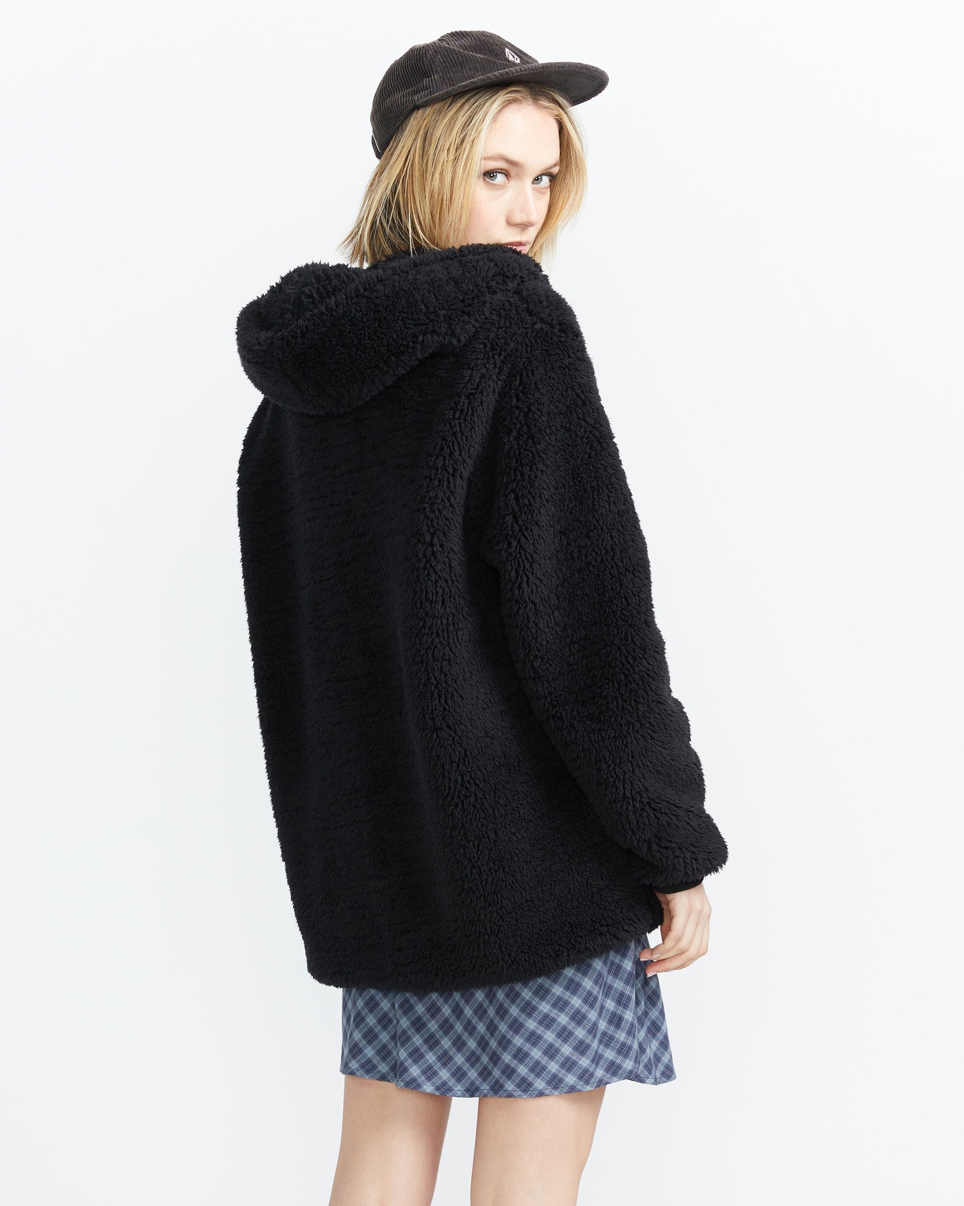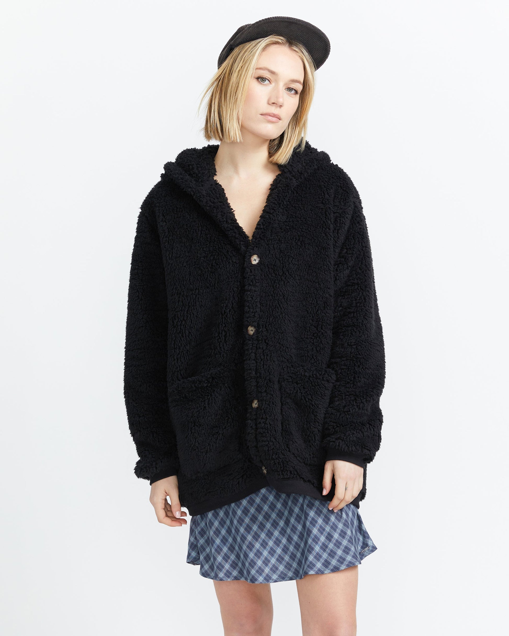 Wrap yourself in cozy style with this oversized sherpa hoodie. The Fyresyde Body Wrap brings laid-back vibes with its button front, patch pockets, and "V" embroidery. Ribbed details at the waist and cuffs keep things snug, while the plush polyester fabric feels like a warm hug on chilly days. Featured here in black.