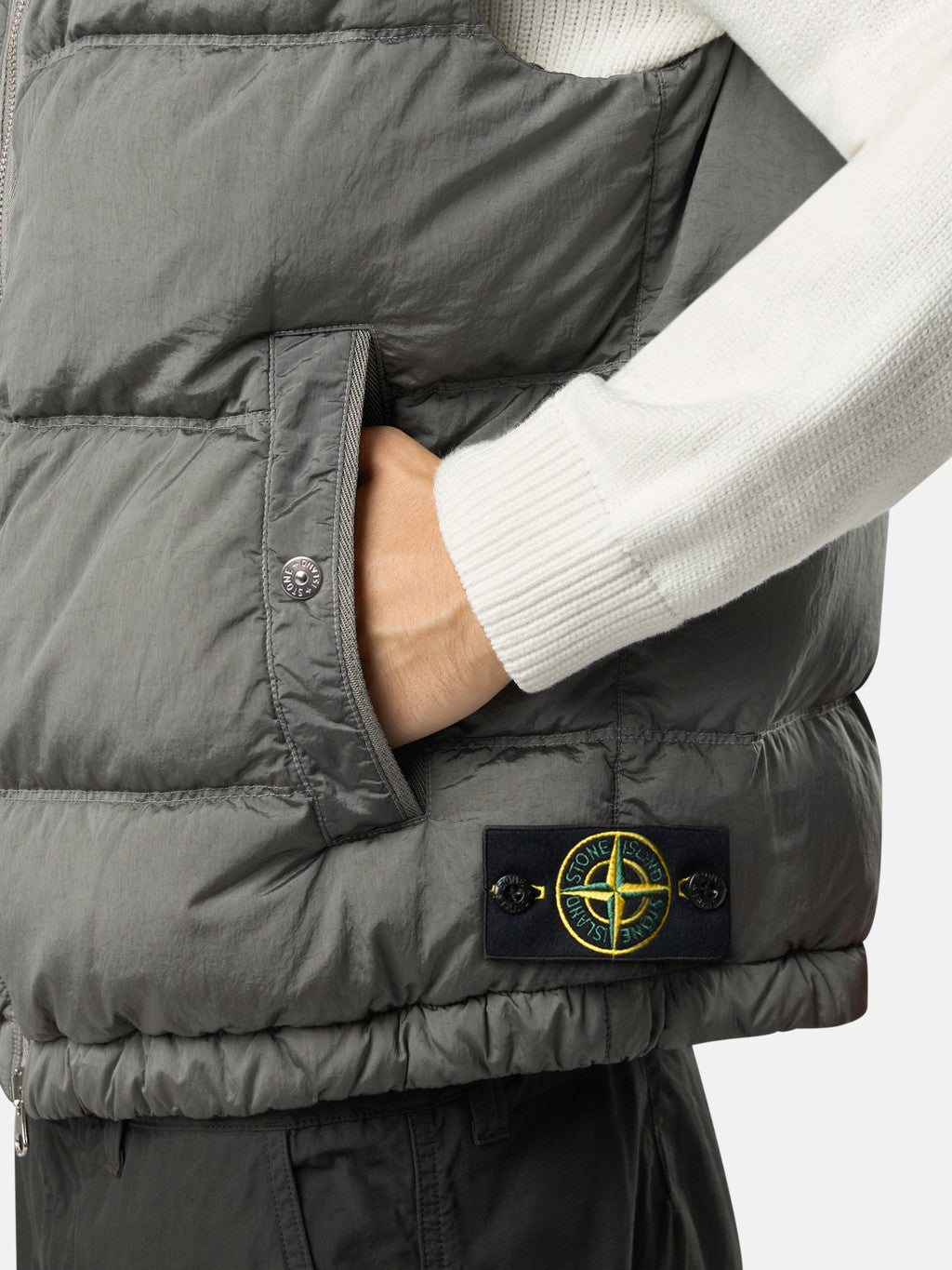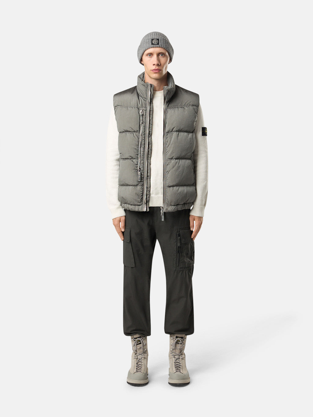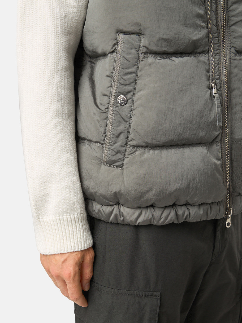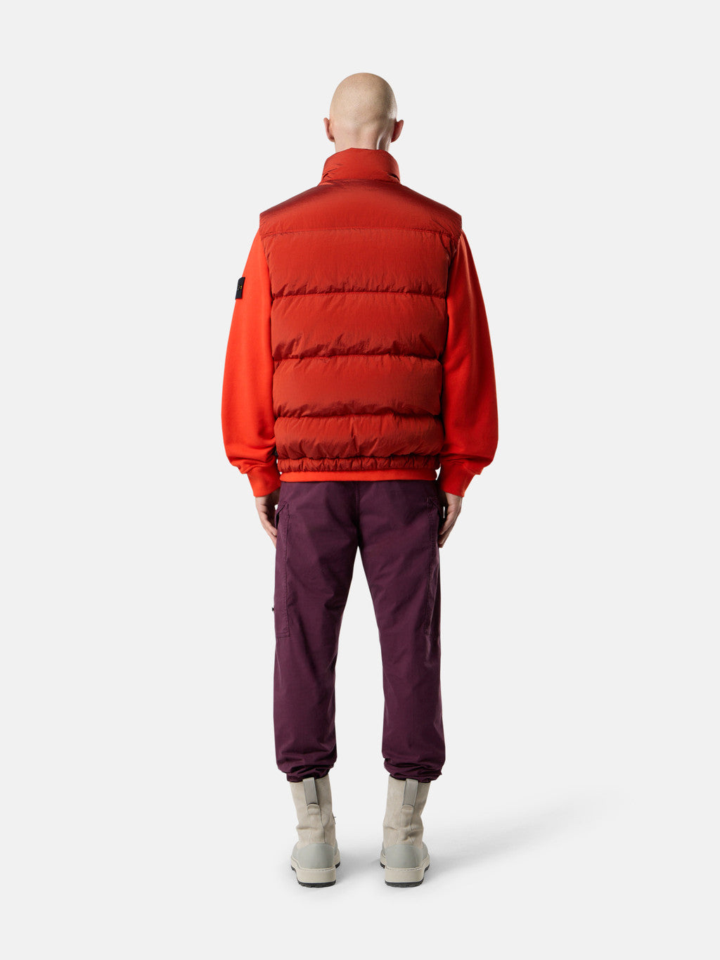 Down vest in Stone Island's iridescent Nylon Metal fabric. The evolution of this iconic fabric sees the use of ECONYL regenerated yarns: the life ended nylon, pre- and post-consumer, is recycled with a complex depolymerization process to create this fibre that features the same intrinsic characteristics of nylon from fossil raw material. Garment dyed with a double colour recipe and the addition of a special anti-drop agent. Padded with the finest feathers specifically treated to withstand the garment dyeing procedure. RDS - Responsible Down Standard certified.