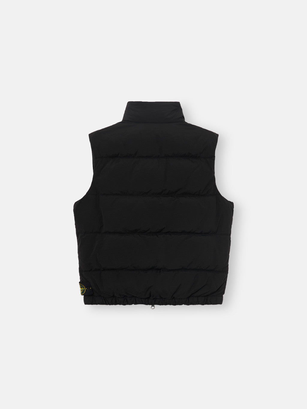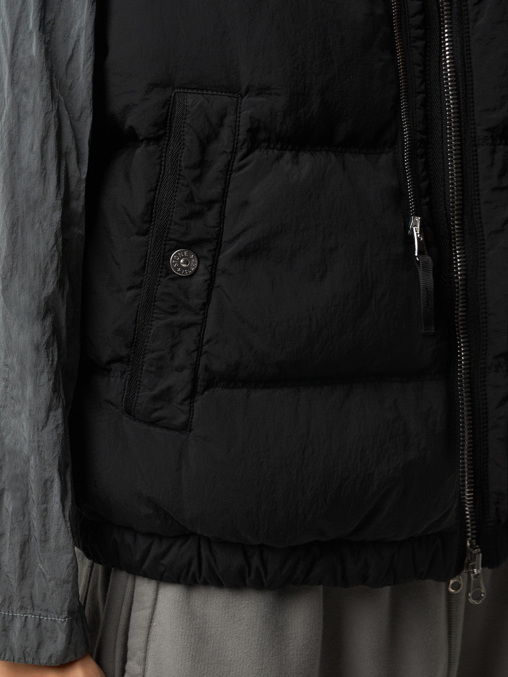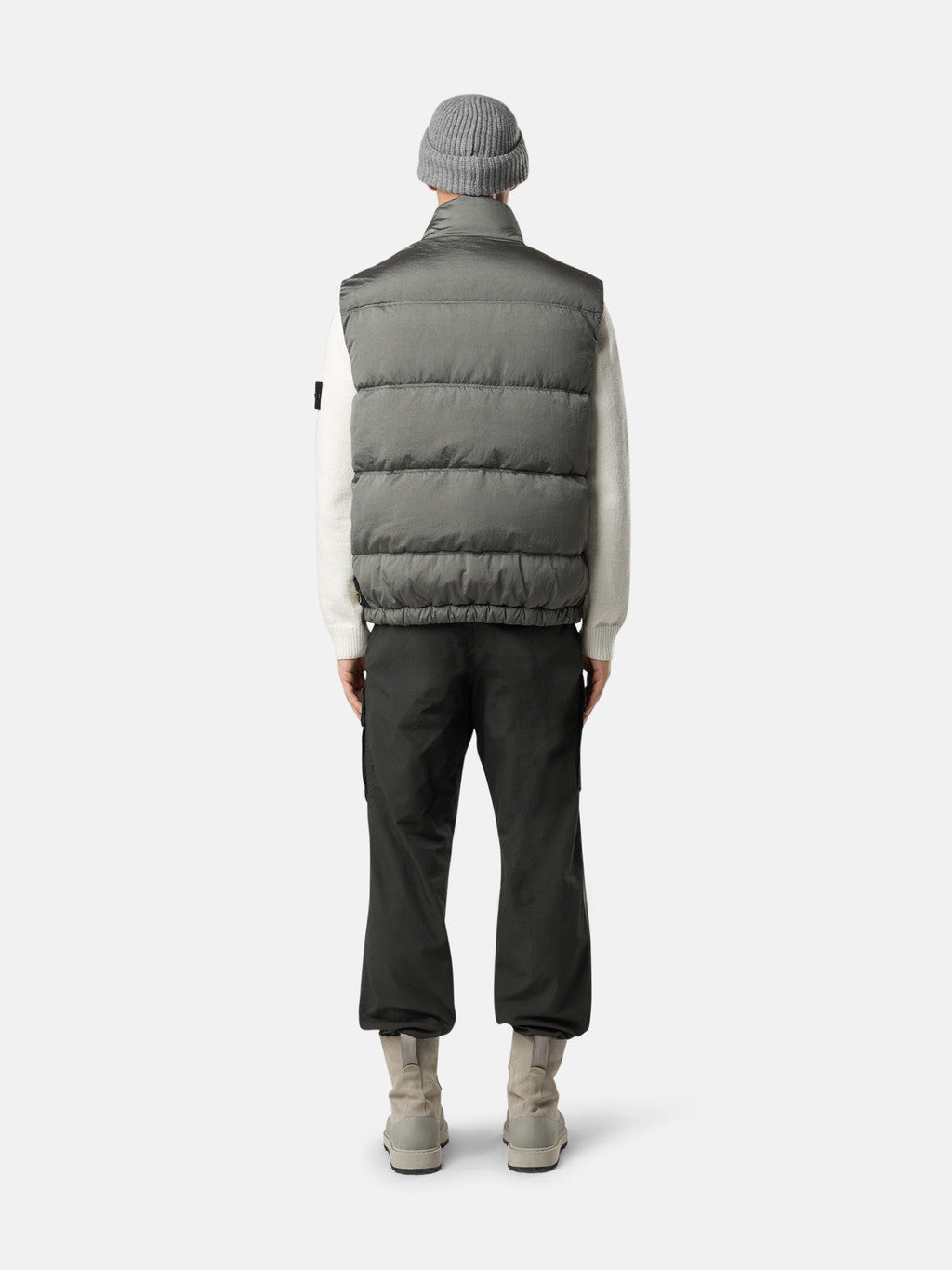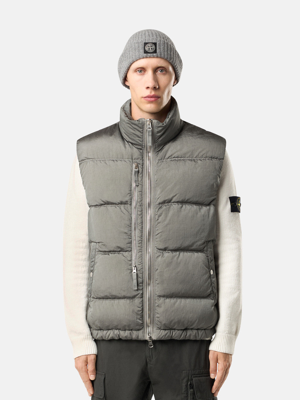Down vest in Stone Island's iridescent Nylon Metal fabric. The evolution of this iconic fabric sees the use of ECONYL regenerated yarns: the life ended nylon, pre- and post-consumer, is recycled with a complex depolymerization process to create this fibre that features the same intrinsic characteristics of nylon from fossil raw material. Garment dyed with a double colour recipe and the addition of a special anti-drop agent. Padded with the finest feathers specifically treated to withstand the garment dyeing procedure. RDS - Responsible Down Standard certified.