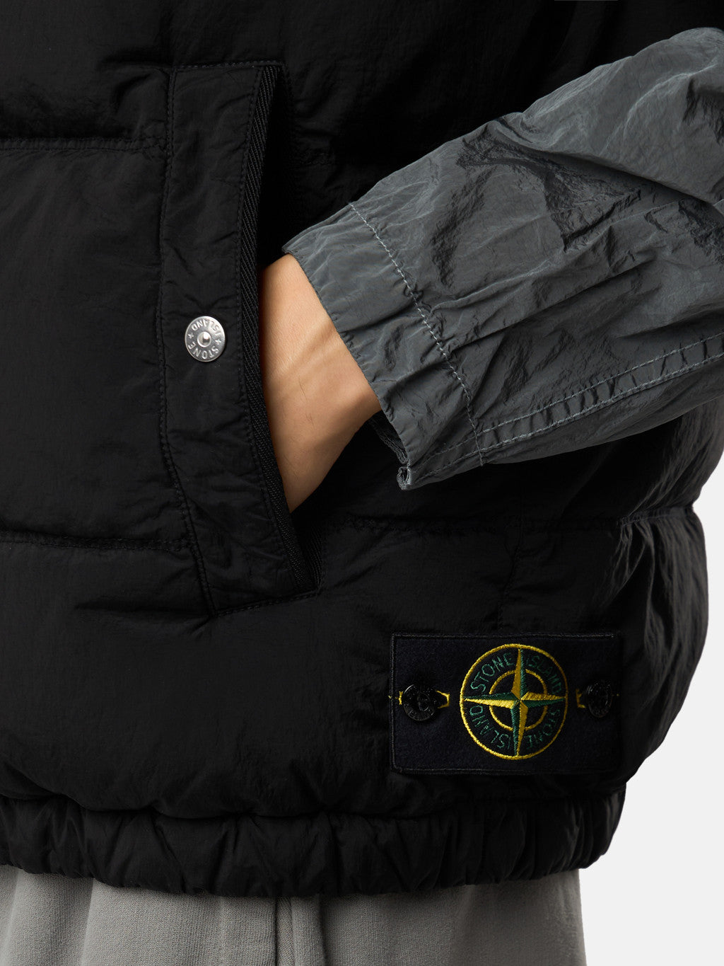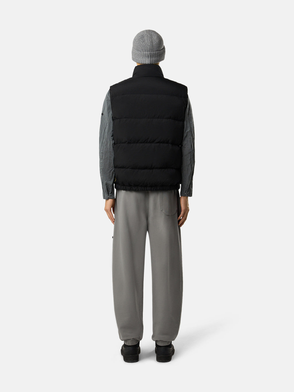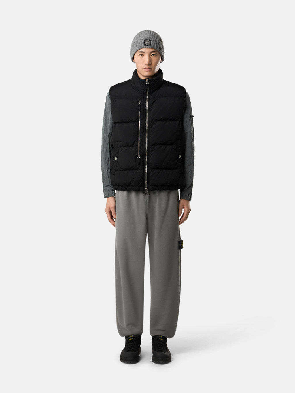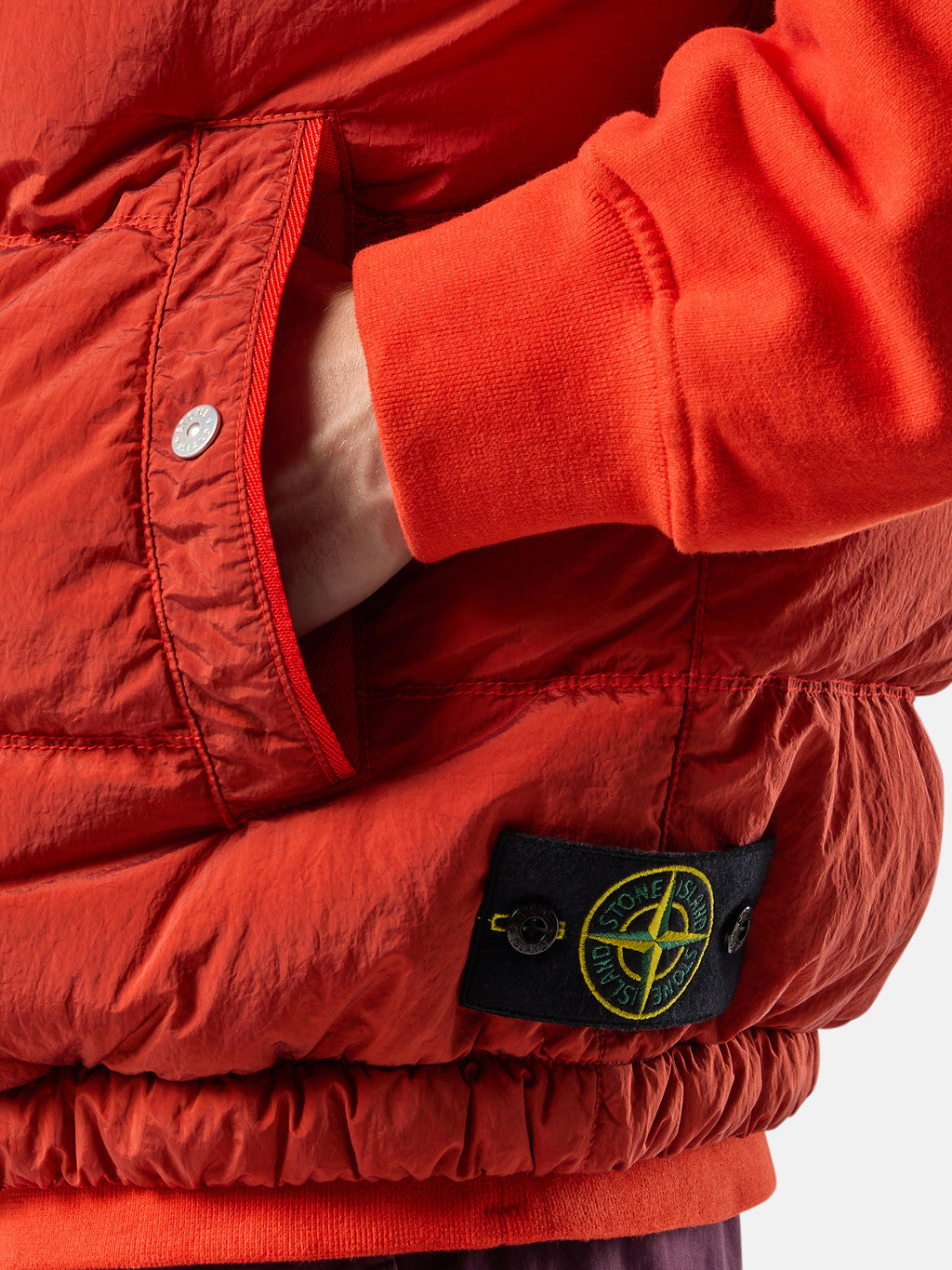 Down vest in Stone Island's iridescent Nylon Metal fabric. The evolution of this iconic fabric sees the use of ECONYL regenerated yarns: the life ended nylon, pre- and post-consumer, is recycled with a complex depolymerization process to create this fibre that features the same intrinsic characteristics of nylon from fossil raw material. Garment dyed with a double colour recipe and the addition of a special anti-drop agent. Padded with the finest feathers specifically treated to withstand the garment dyeing procedure. RDS - Responsible Down Standard certified.
