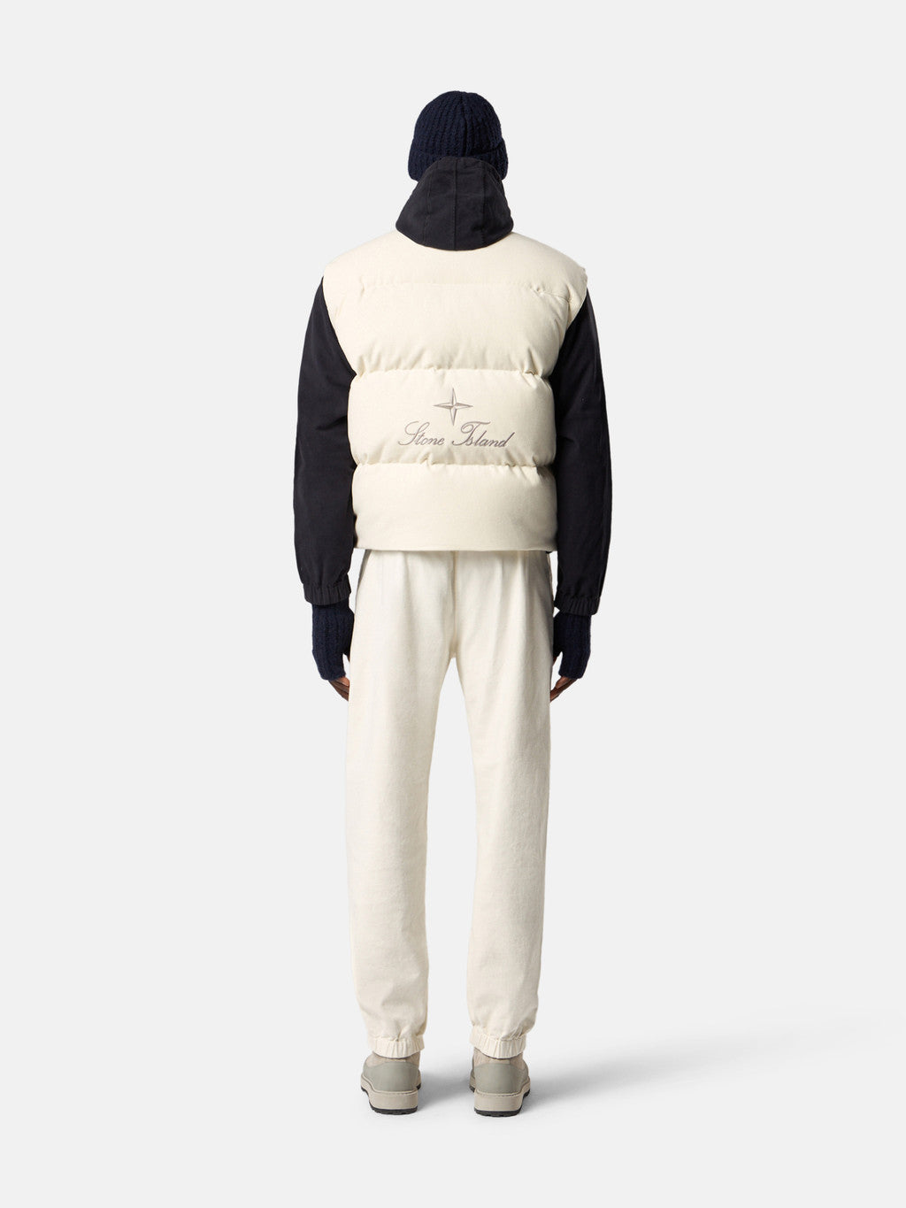Down vest made from a cotton moleskin. The fabric's double-faced satin weave is brushed and sheared externally to achieve a warm and velvet-like hand. The fabric is resin-treated with a special anti-drop agent, making it wind resistant and mildly water resistant. RDS - Responsible Down Standard certified.
