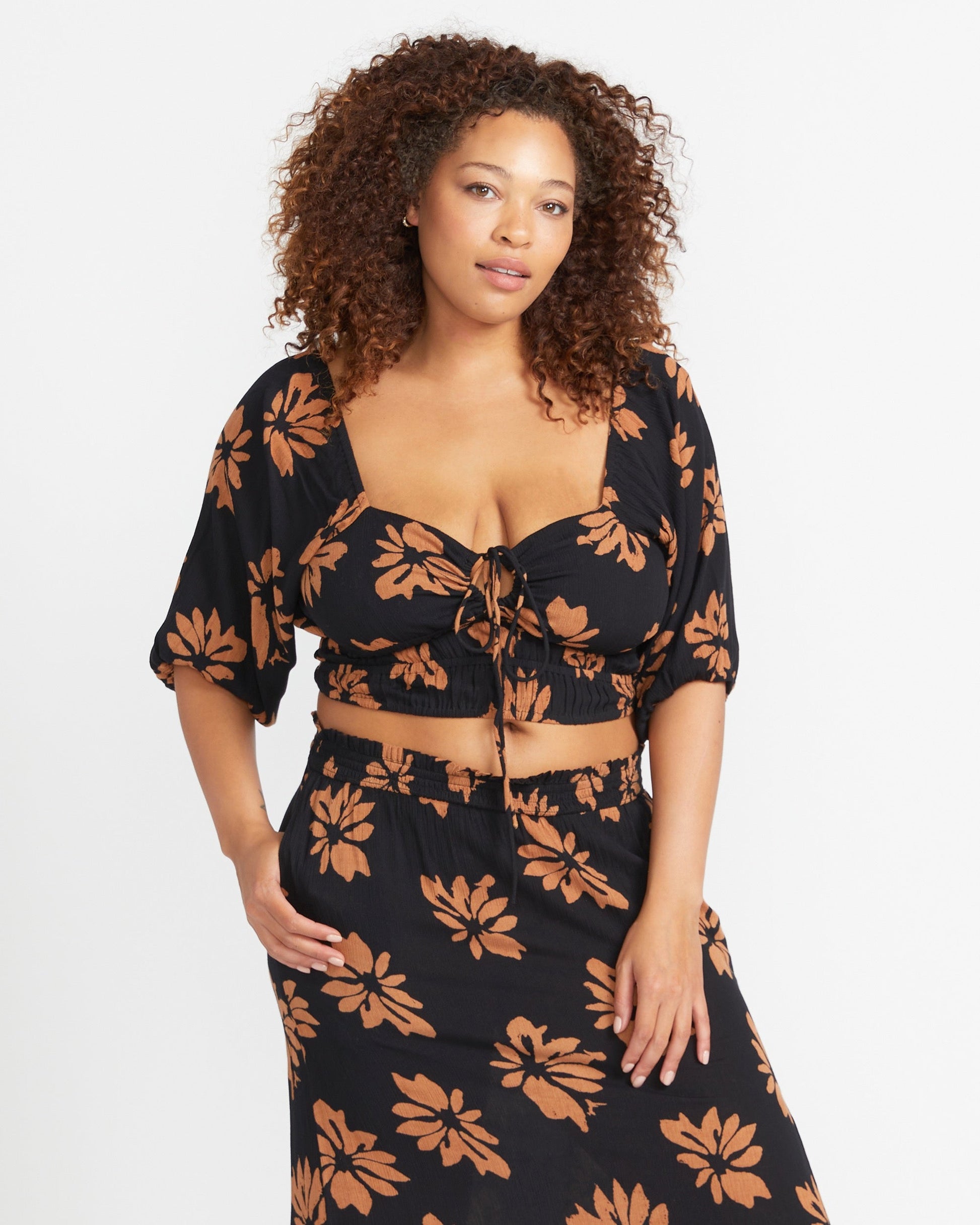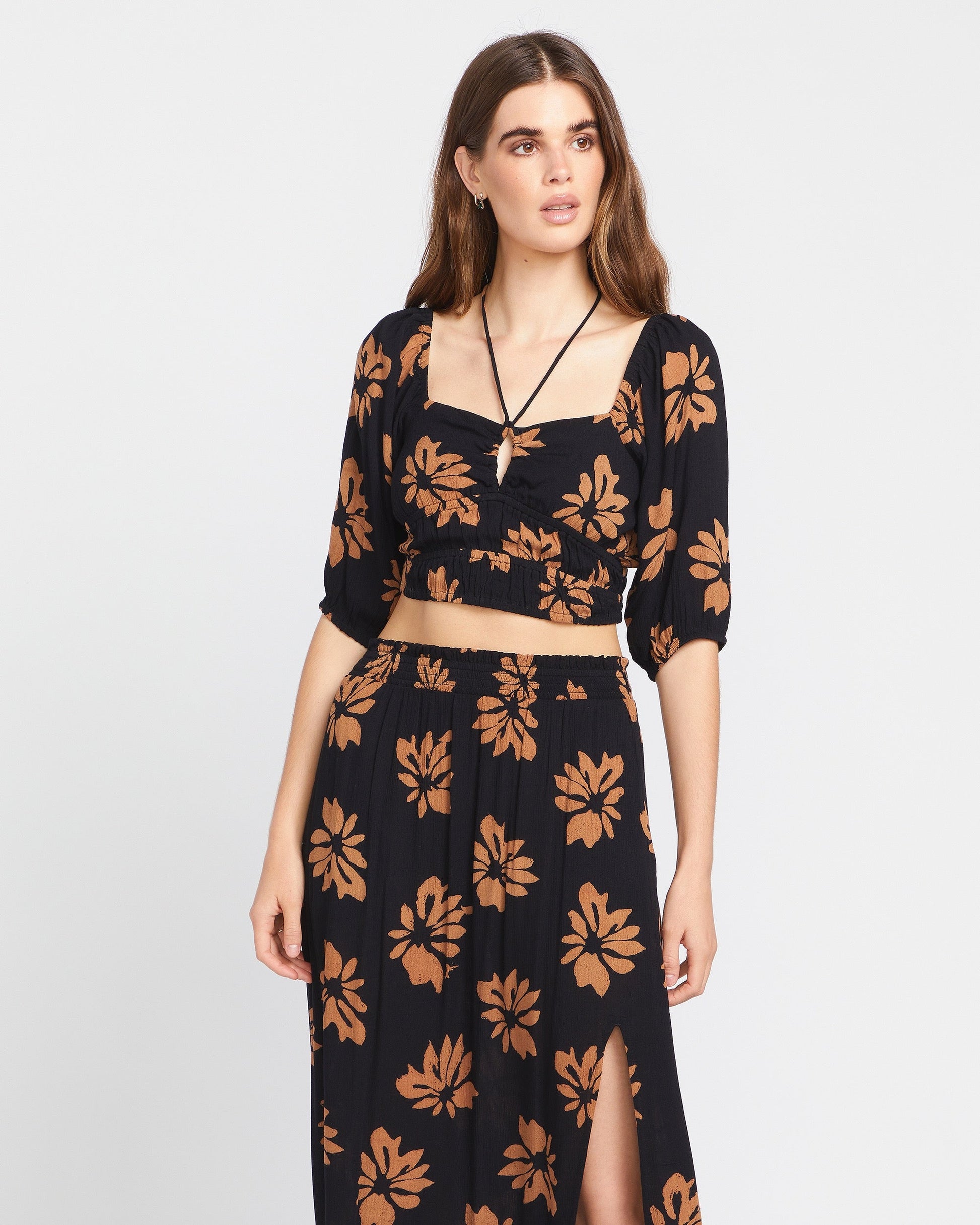 Slip into this sassy top and Get Wyyld. This 100% viscose flattened gauze top features a unique all-over printed design and elasticated short sleeves for a fitted, flattering look. Drawstring tunnels at the chest and waist add a touch of playful style, while the metal badge at the back lends a sleek finish. Pair this versatile top with your favorite jeans for an effortlessly chic vibe. Featured here in brown.
