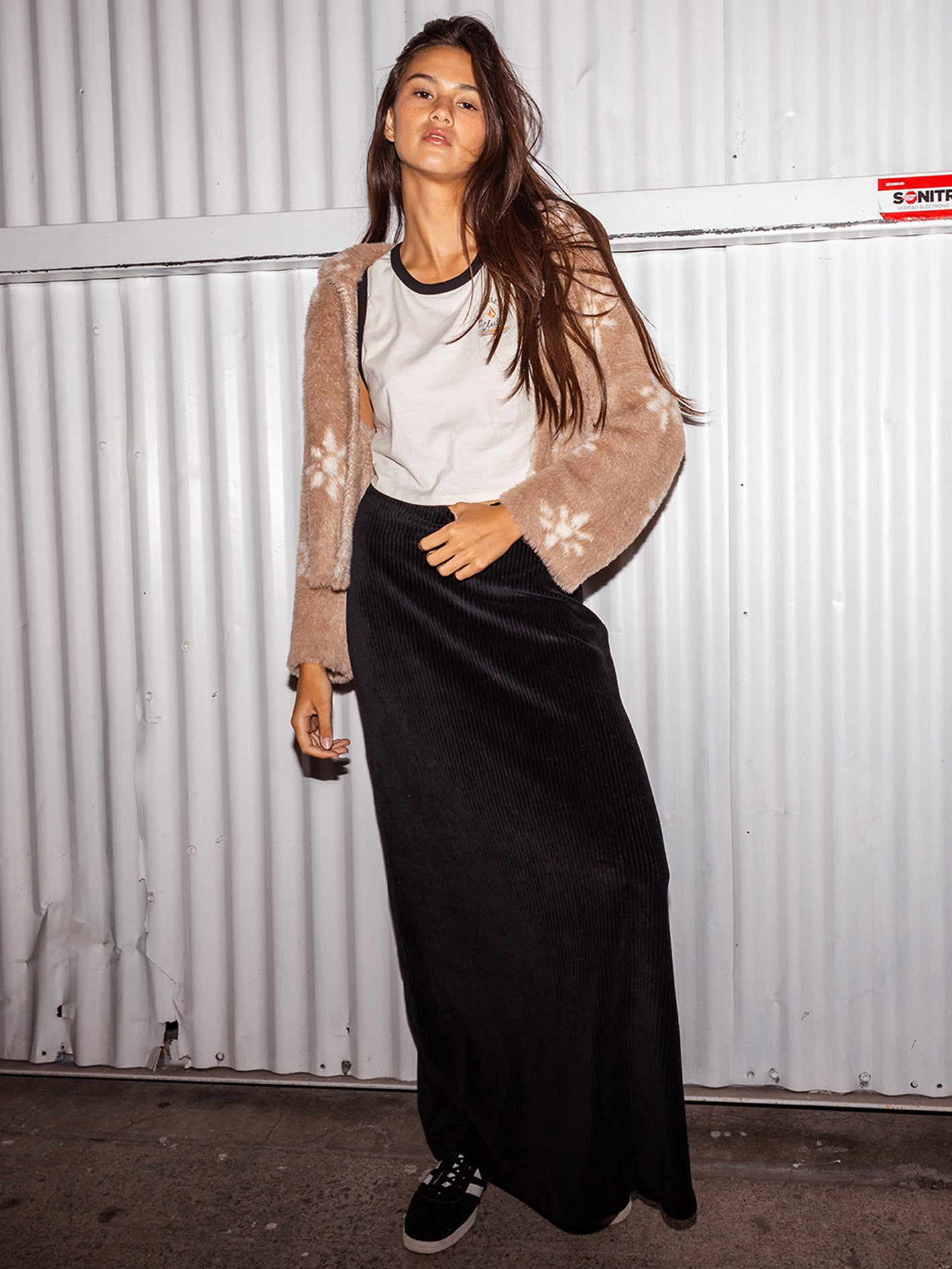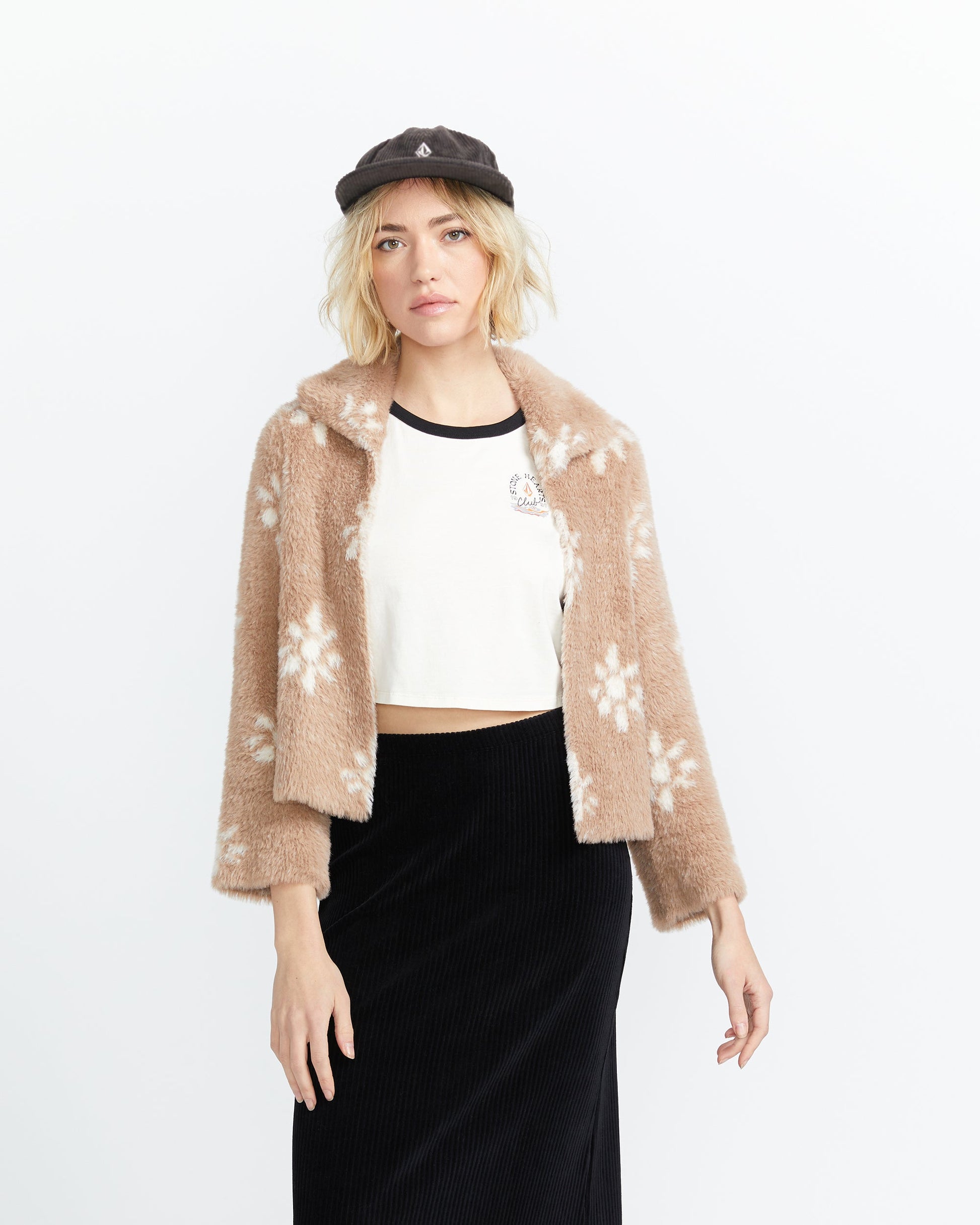 • High piled faux fur sweater jacket with allover flower jacquard pattern and cropped fit