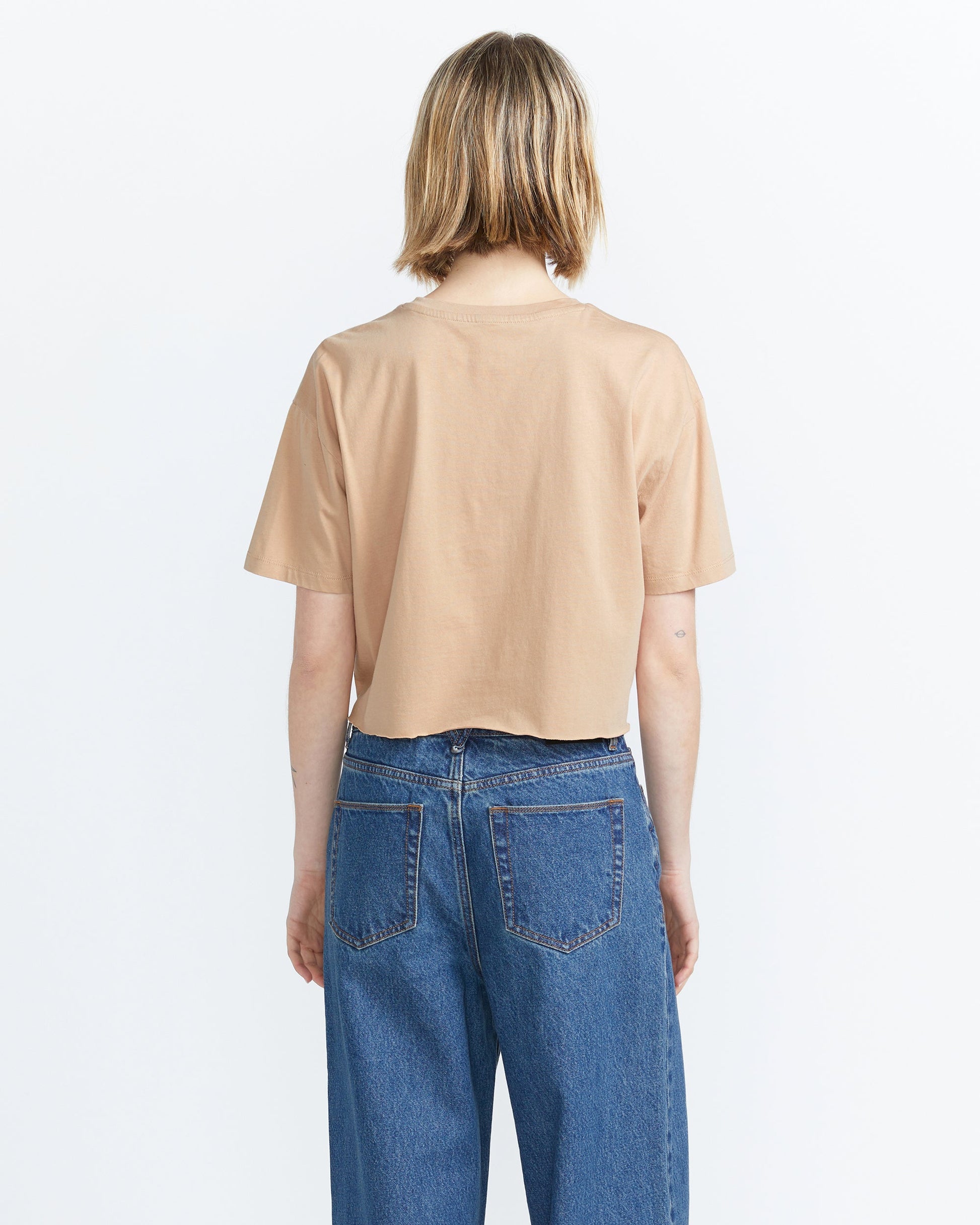 Embrace comfort with this organic cotton tee from "V". The Just A Trim Short Sleeve features a raw edge hem and rib neckband for laid-back style, while striped interior neck taping adds a subtle pop. With a chest screenprint and breathable 145 GSM fabric, it's your new go-to for effortless fashion. Featured here in sandstorm.
