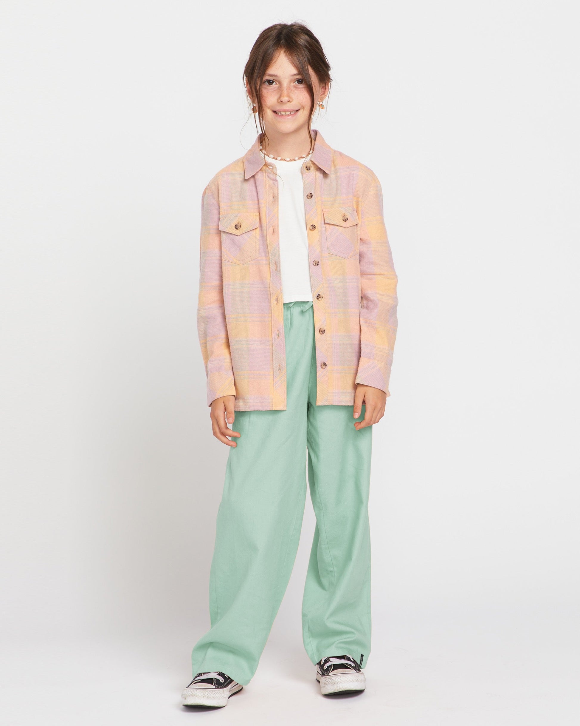 - Collared flannel shirt with chest patch pockets, shirt tail hem and tortoiseshell button placket