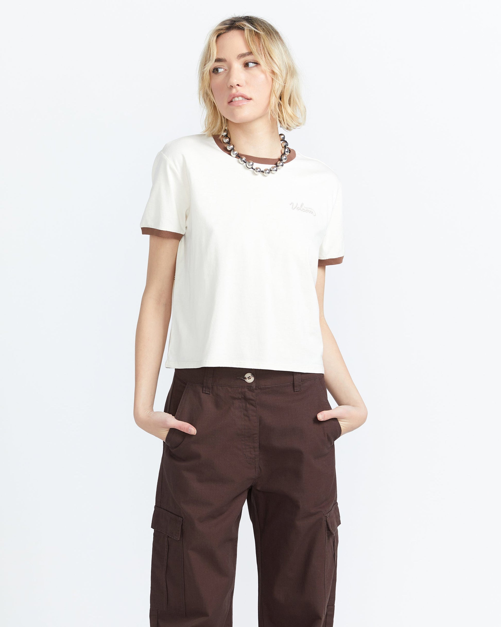 Embrace style with this organic cotton tee from "V". The Meet Me There Ringer features a classic short-sleeve silhouette with a trendy rib neckband and striped interior taping. Eye-catching screen-prints on the chest and back add a cool, casual vibe. Perfect for laid-back days or beach adventures. Featured here in bone.