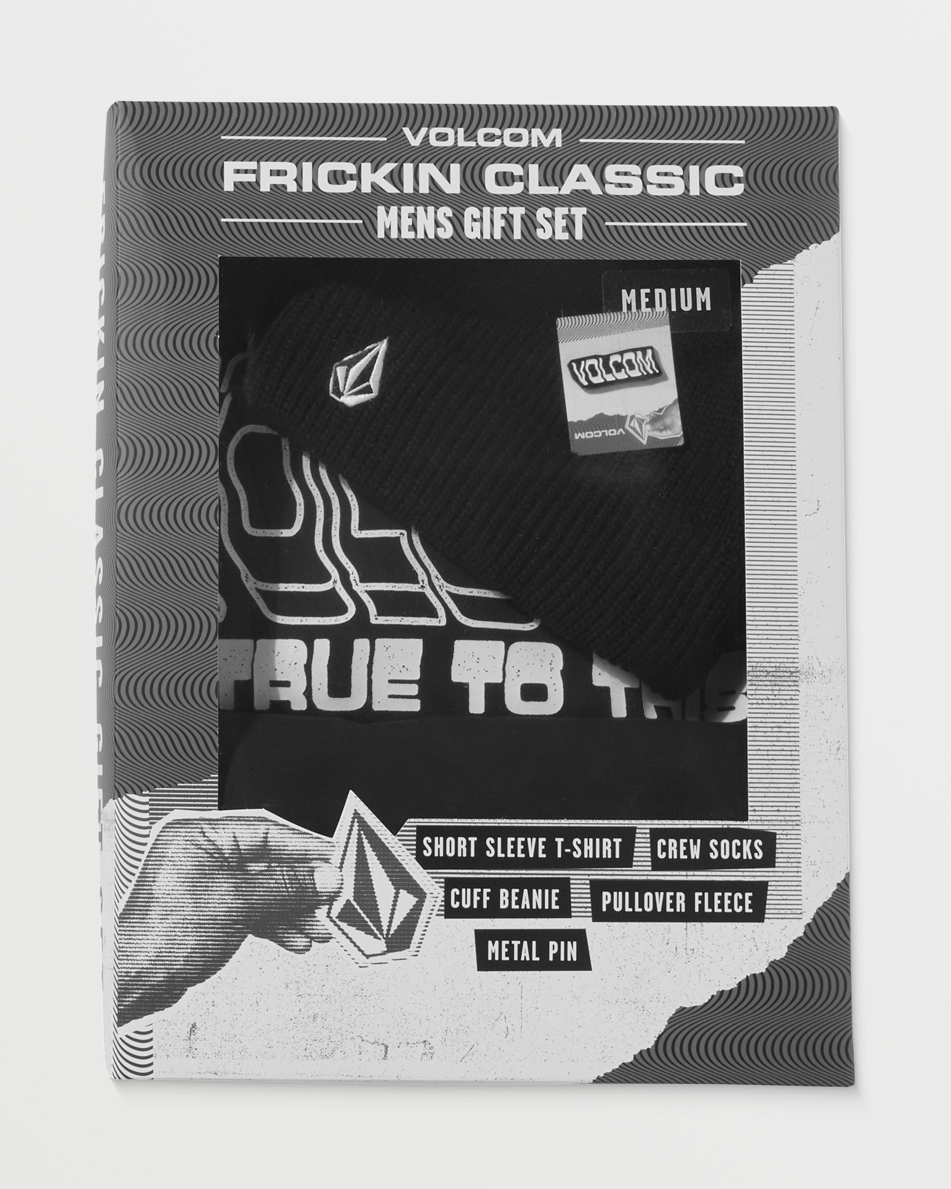Stock up on all the Frickin Classics: pullover fleece, tee, beanie, socks, and metal pin. Our "V" gift set keeps him warm, cozy and styling in coordinated threads, from head to toe. Perfect present for layering his favorite looks.