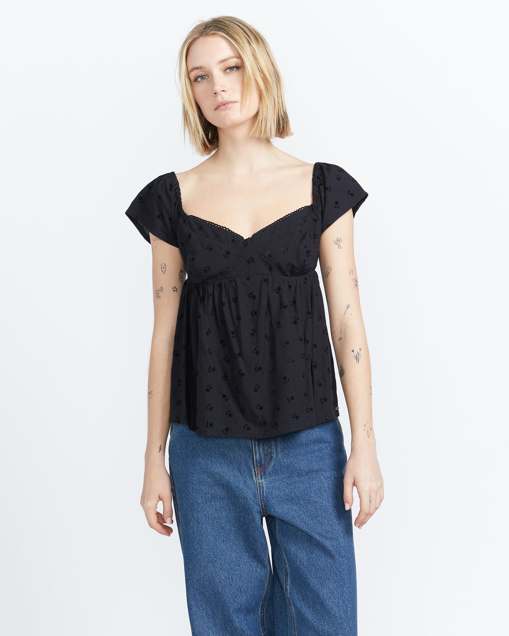 • Cap sleeved top with corseted bodice seaming at chest and smocked back panel