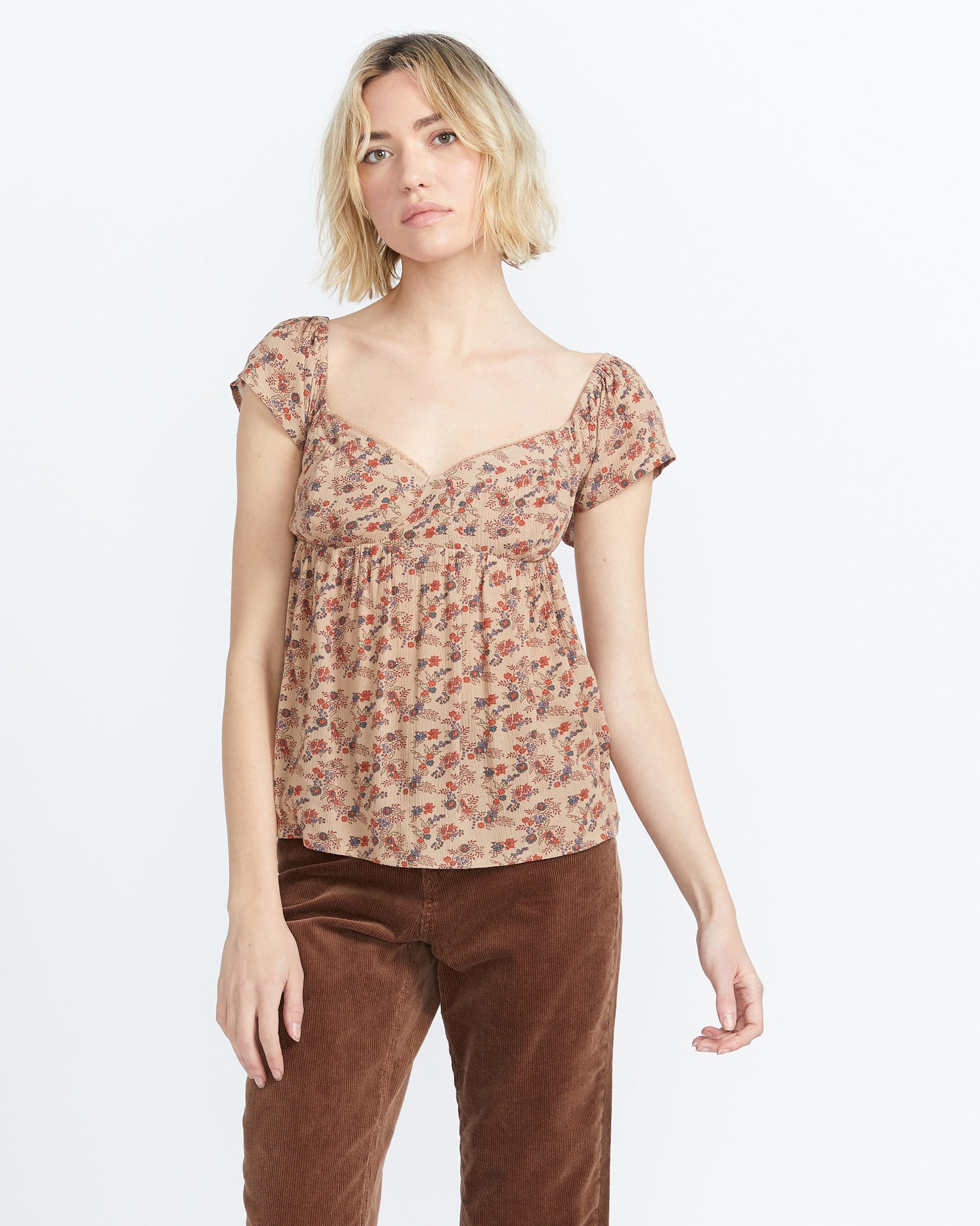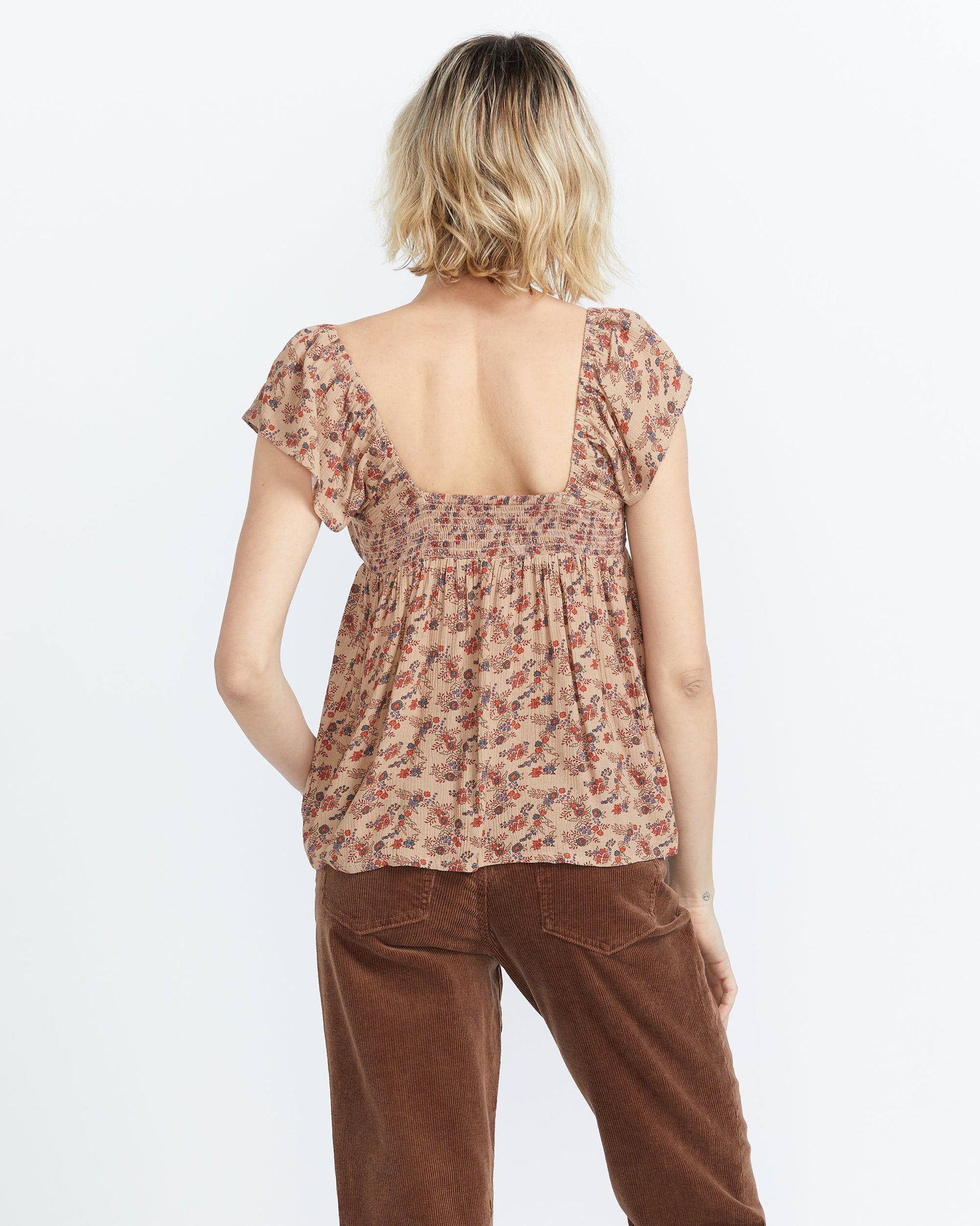 Embrace your flirty side with this breezy cap-sleeved top. The corseted bodice and smocked back panel create a flattering silhouette, while delicate lace trim adds a feminine touch. Crafted from soft viscose gauze with an allover print, it's perfect for beach days or casual outings. The metal badge detail completes this versatile summer essential. Featured here in rust.