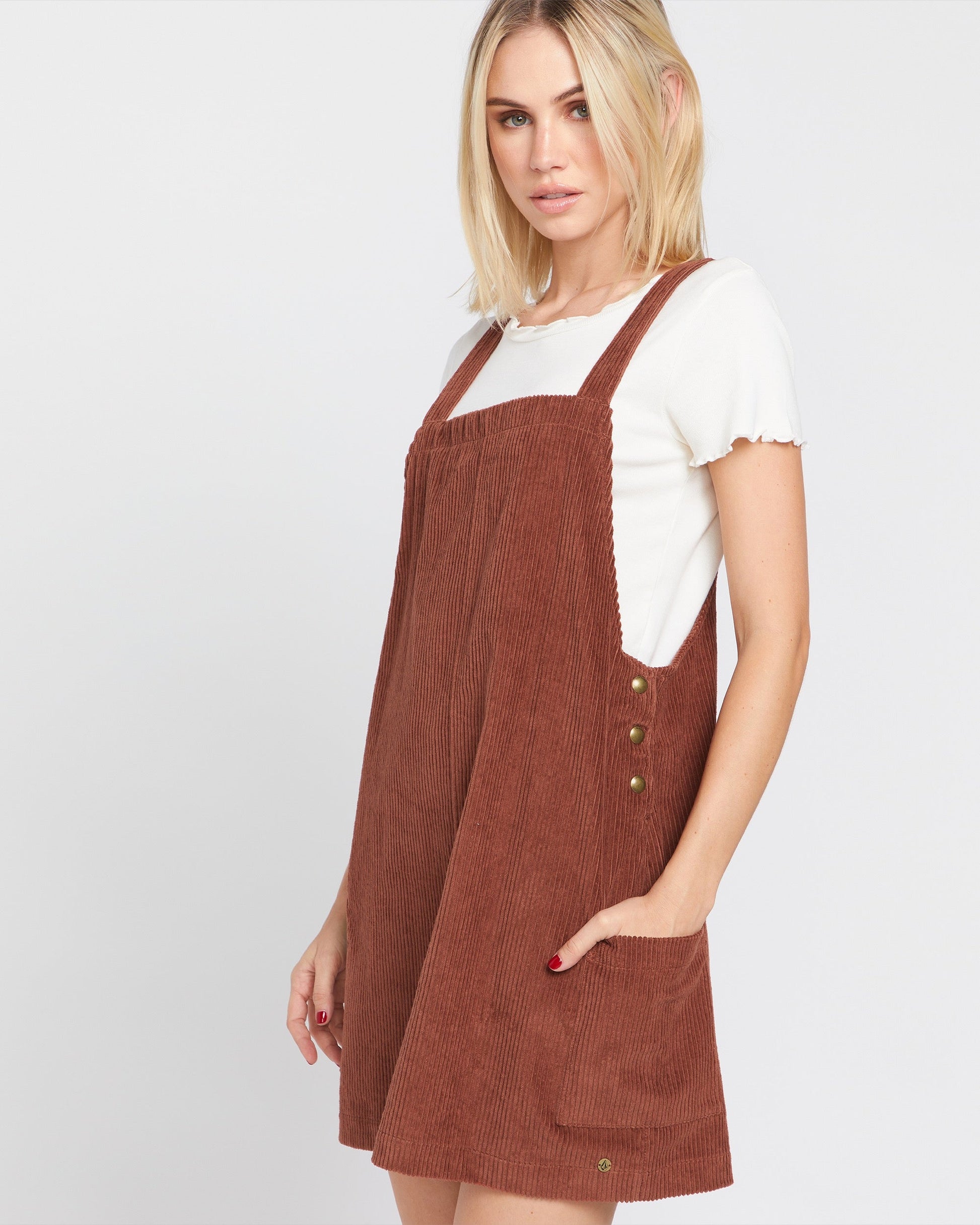 Crafted from soft, durable corduroy, this loose-fitting brown corduroy dress features adjustable overall straps, metal hardware, and pockets for function and flair. The stone embroidery adds a signature touch to this vintage-inspired piece.