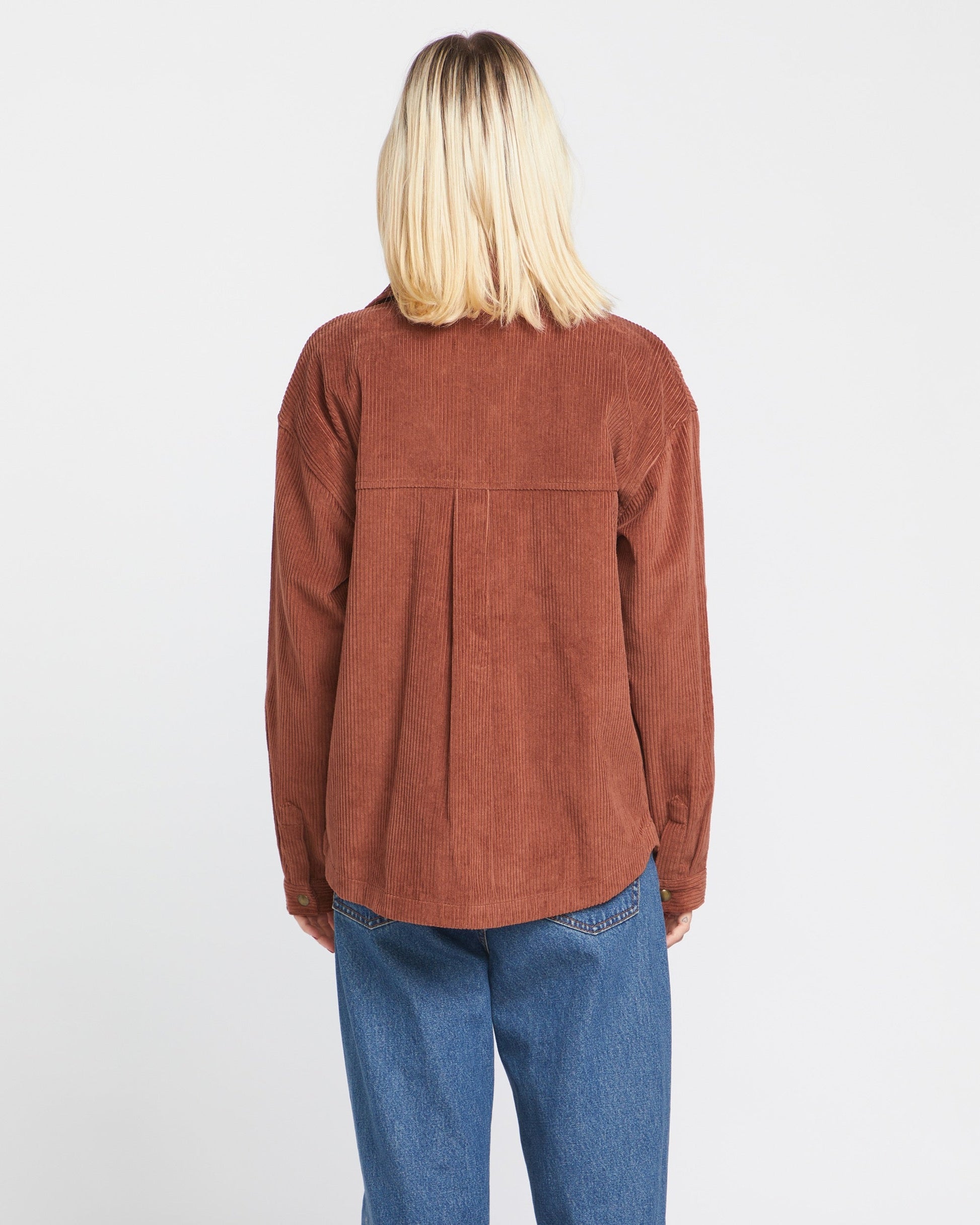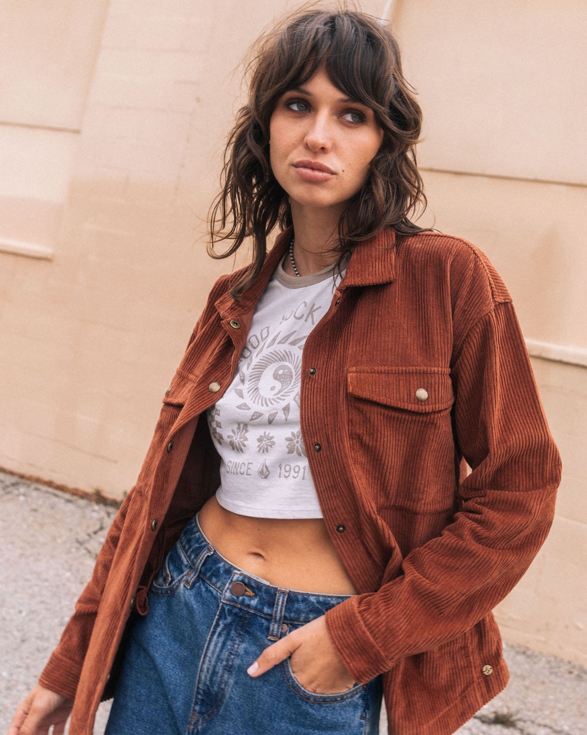 The Power Chord Shacket from "V" is a versatile 100% cotton corduroy piece that blends the comfort of a shirt with the durability of a jacket. Snap-front closure, cargo pockets, and adjustable cuffs offer function, while the soft fabric and stylish metal badge deliver a laidback streetwear vibe. This shacket is a chord-ially cool addition to any wardrobe. Featured here in brown.