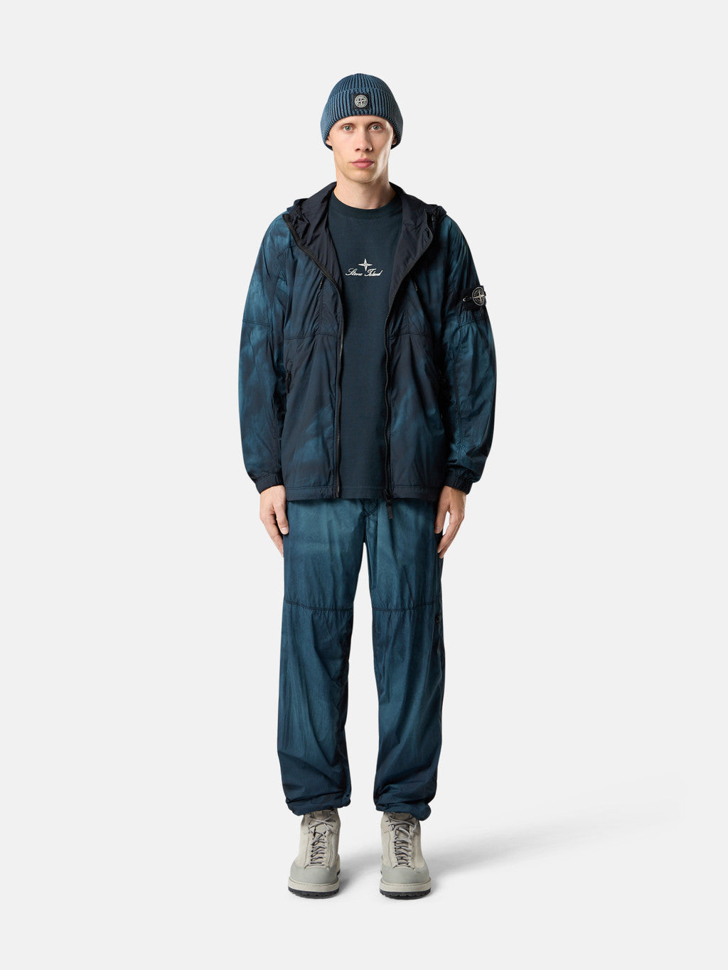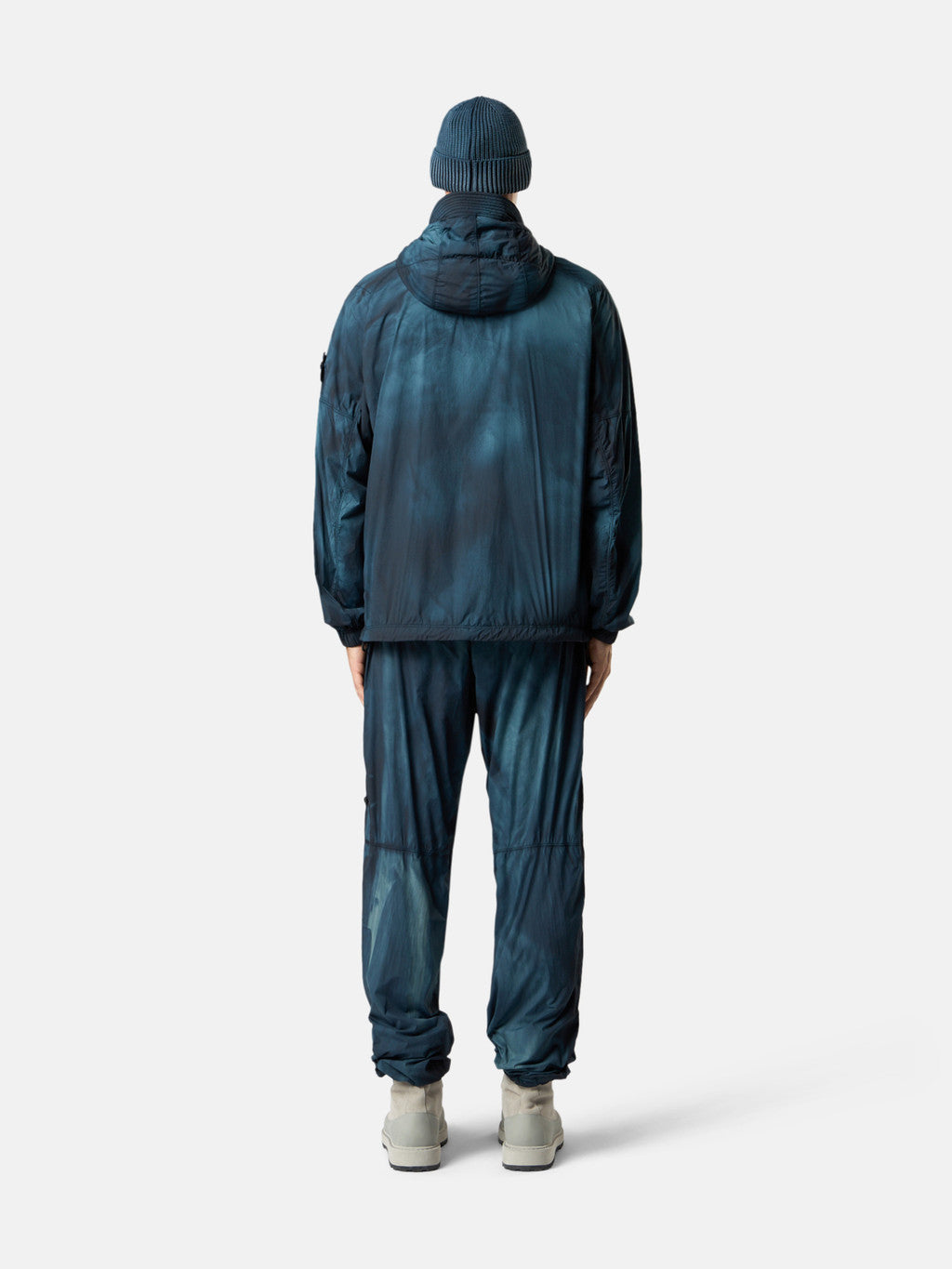 Hooded jacket made from a performance fabric using ultra-fine denier microfibre nylon yarns with a thin wind- and water-resistant coating. Garment dyed with carefully selected dyes, then faded through an innovative corrosion treatment, reflecting Stone Island's ongoing commitment to research and experimentation. The corroded areas take on a worn appearance and varying colours due to the irregularity of the treatment, creating a blurred effect and making each piece unique. Nylon mesh lining.