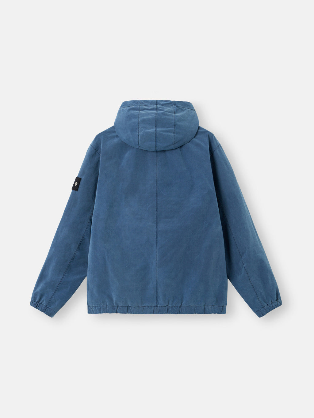 Hooded jacket made from a lightweight tela woven with Japanese polyester/polyamide yarns featuring a star-shaped cross-section. The pieces are assembled and then dyed with indigo pigment and the addition of an anti-drop agent in a complex and exclusive dyeing process. During the garment dyeing process, the heat radically transforms the material's hand and structure. The innovative combination of indigo and man-made fibres reflects Stone Island's constant dedication to research and experimentation.