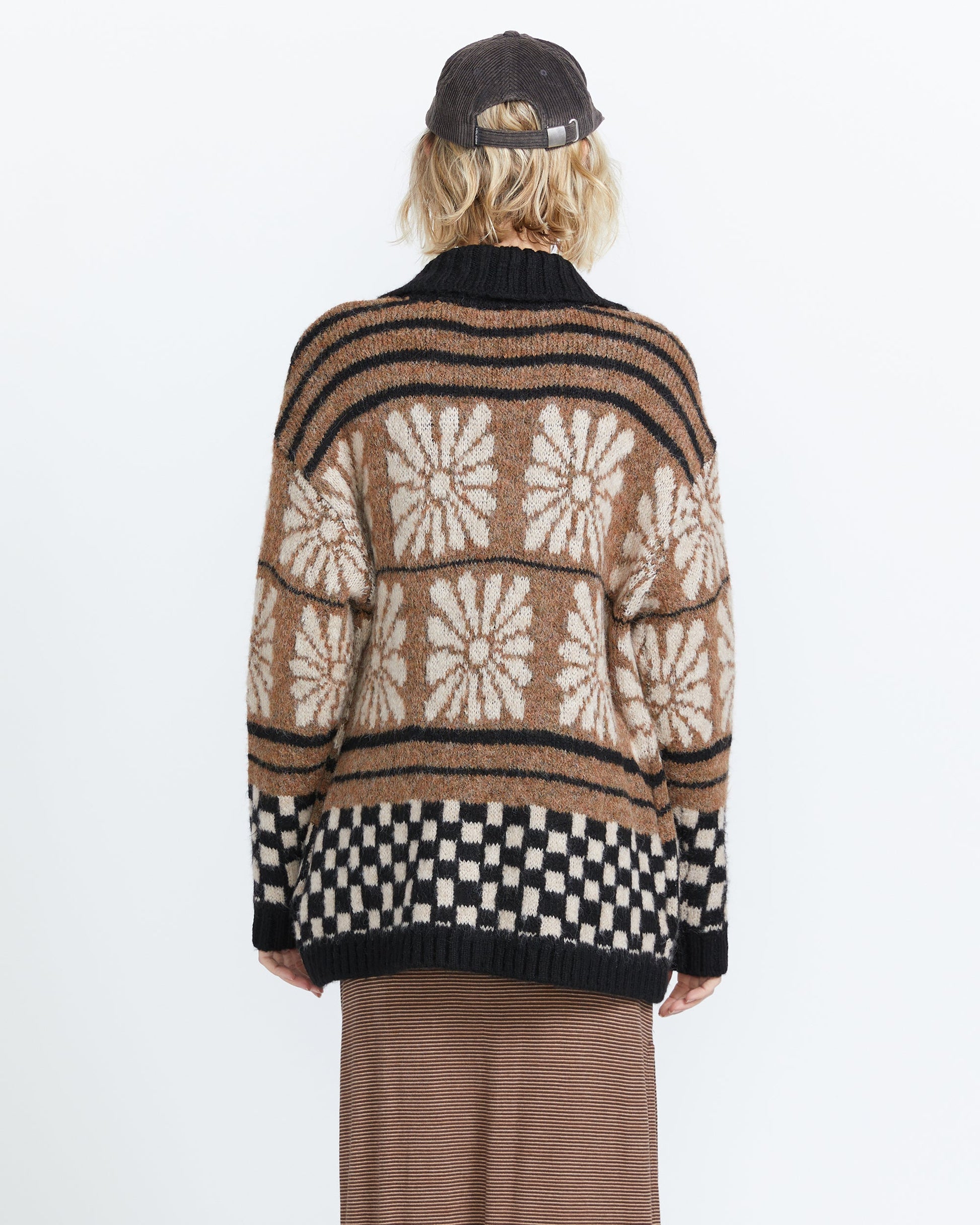 Cozy up in vintage-inspired style with this oversized "grandpa" cardigan. The wool-blend knit features a whimsical daisy and checkerboard pattern, while tortoiseshell buttons add a classic touch. With its shawl collar and roomy pockets, you'll be happy this cardigan is living rent-free in your wardrobe. Featured here in vintage brown.