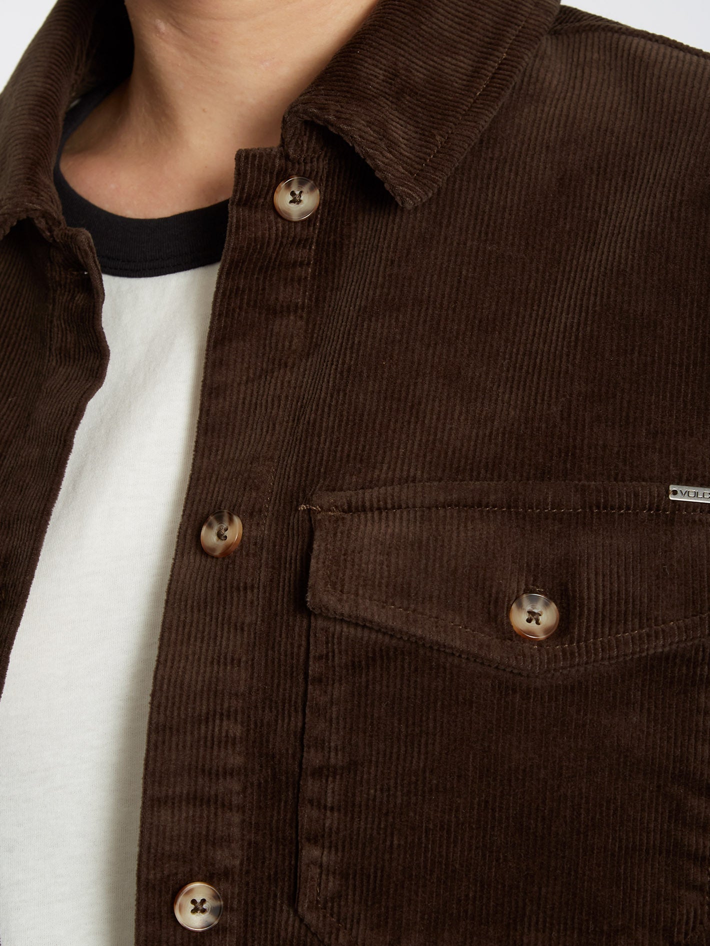 • "V" metal badge at chest pocket