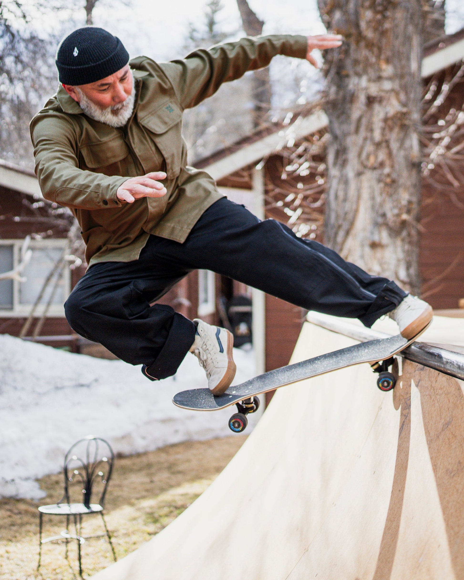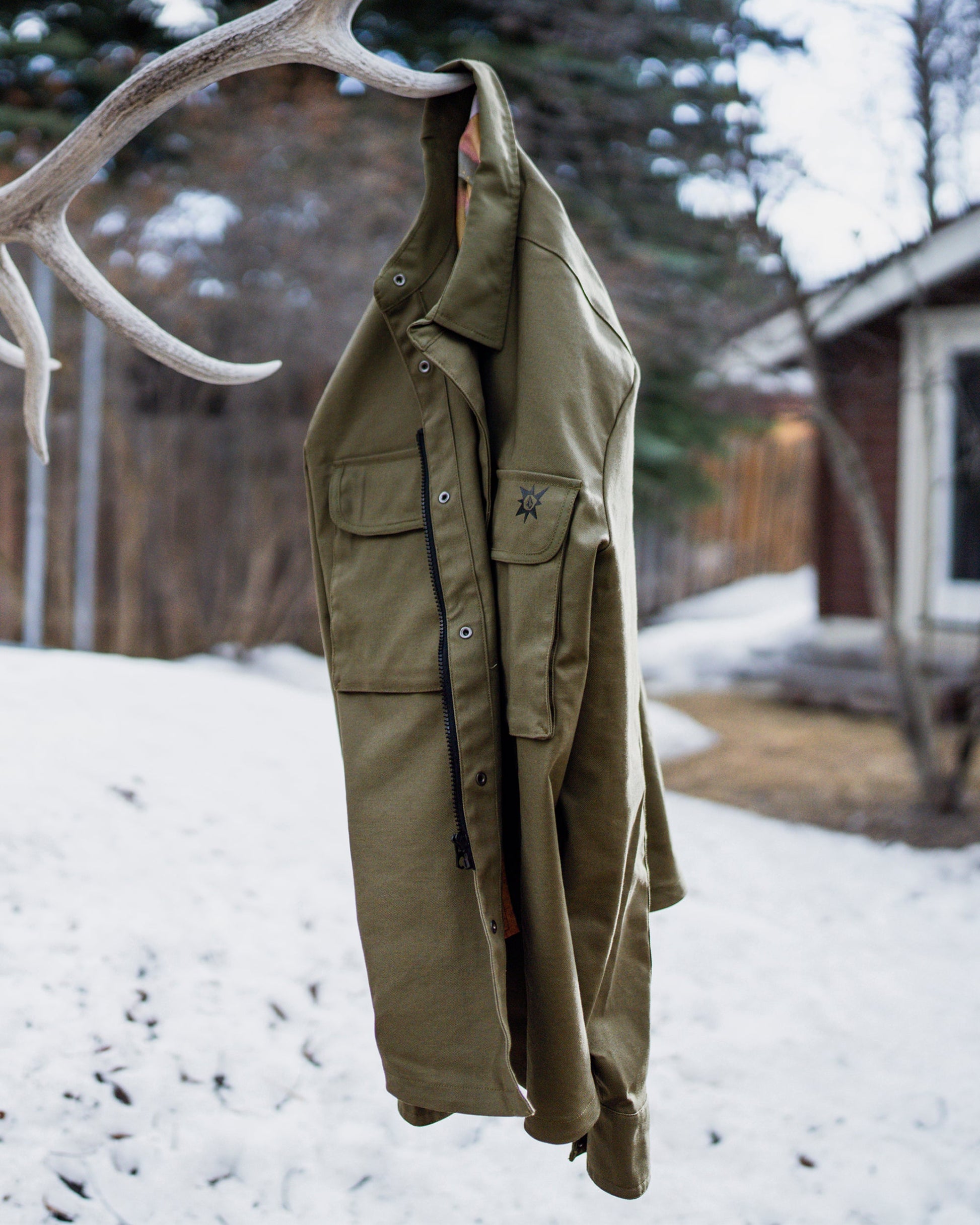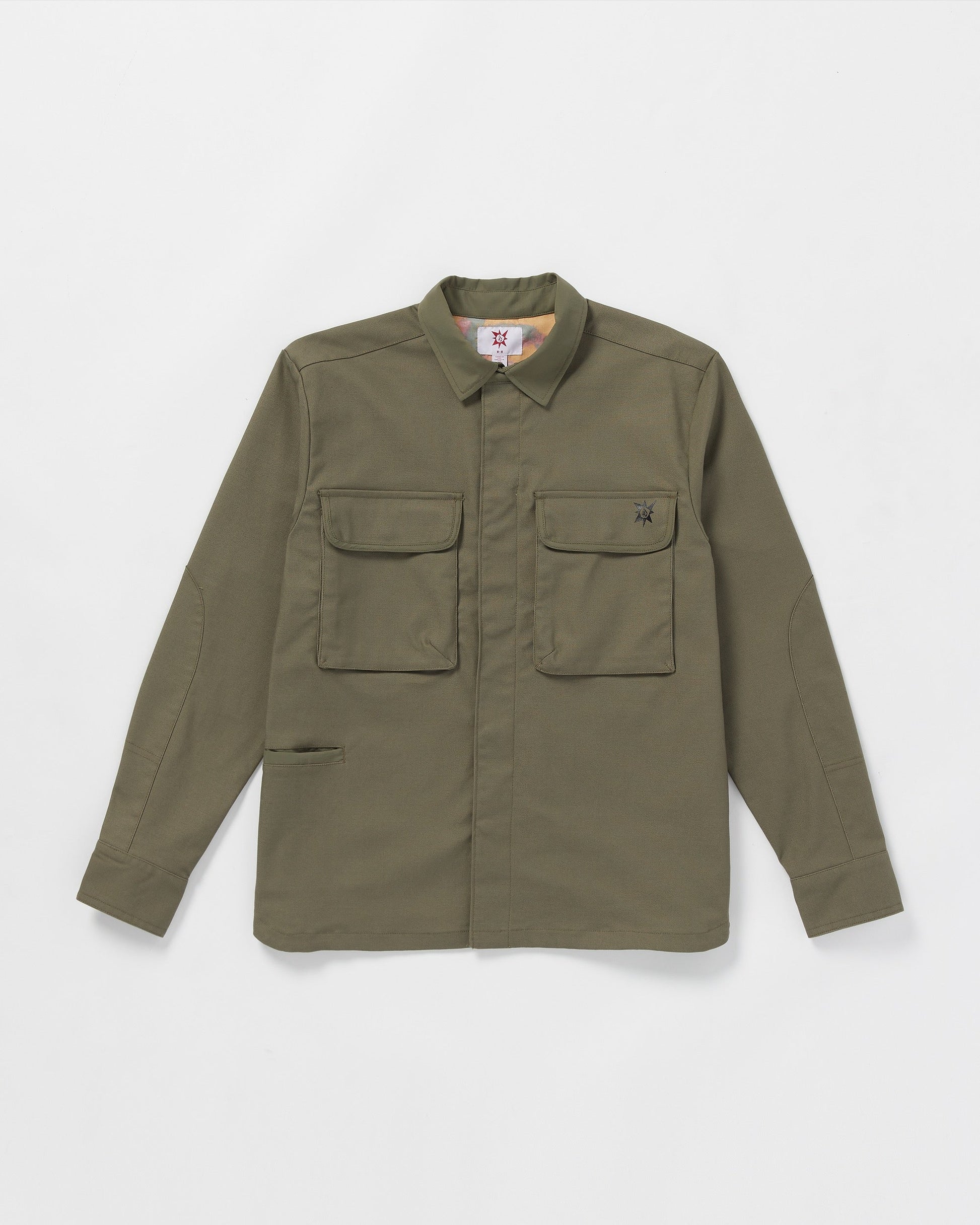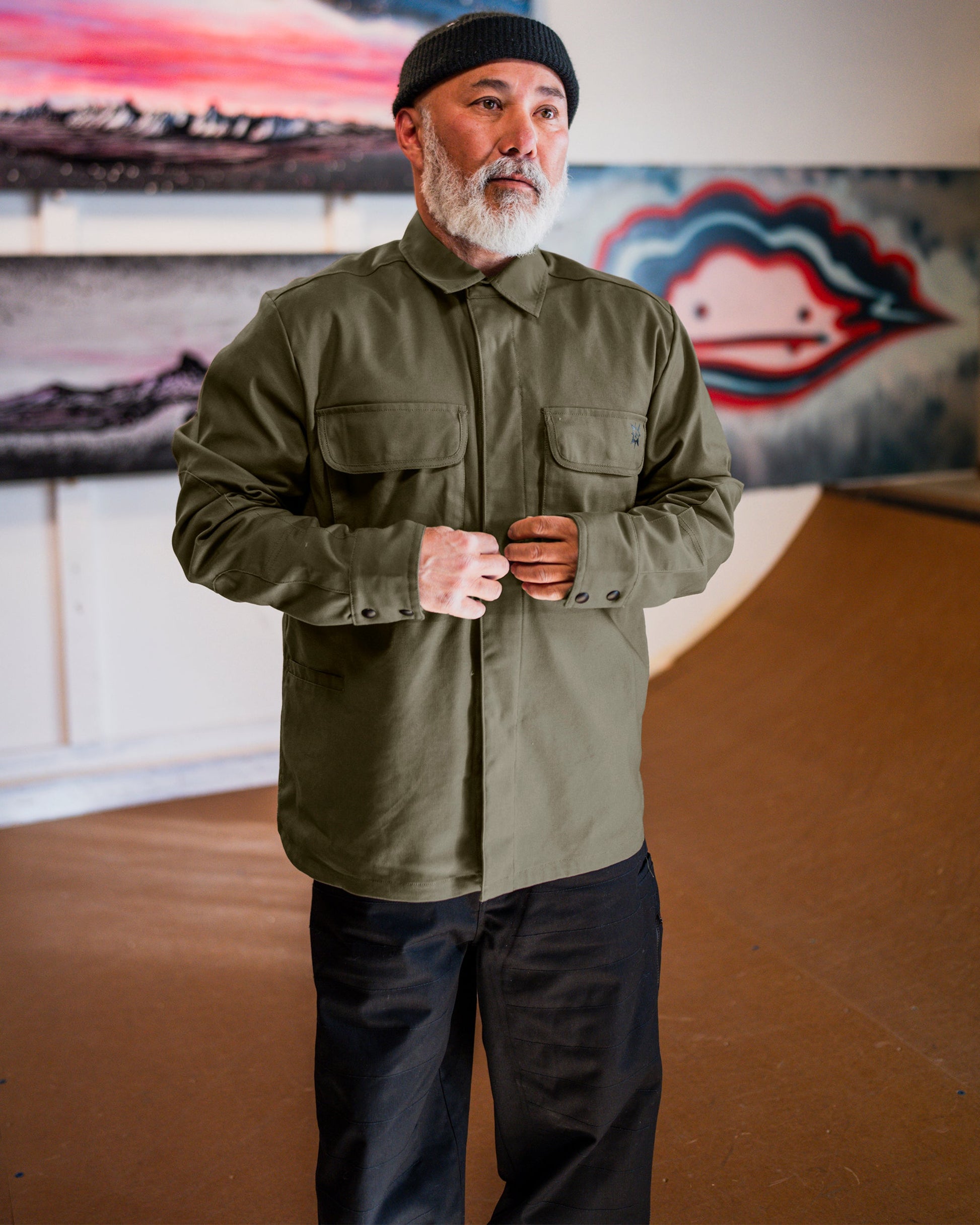 Bryan Iguchi, the legendary snowboarder, partnered with our "V" design team to bring you the Tokyo True collaboration, blending his Japanese heritage and global cult following into a project that resonates universally. This work shirt is crafted from durable cotton-blend canvas that offers a touch of stretch of added mobility. Cut into a roomy boxy fit, it features nylon ripstop details for stronger durability, and a hidden zip-front placket for a sleek, modern look. Featured here in green.