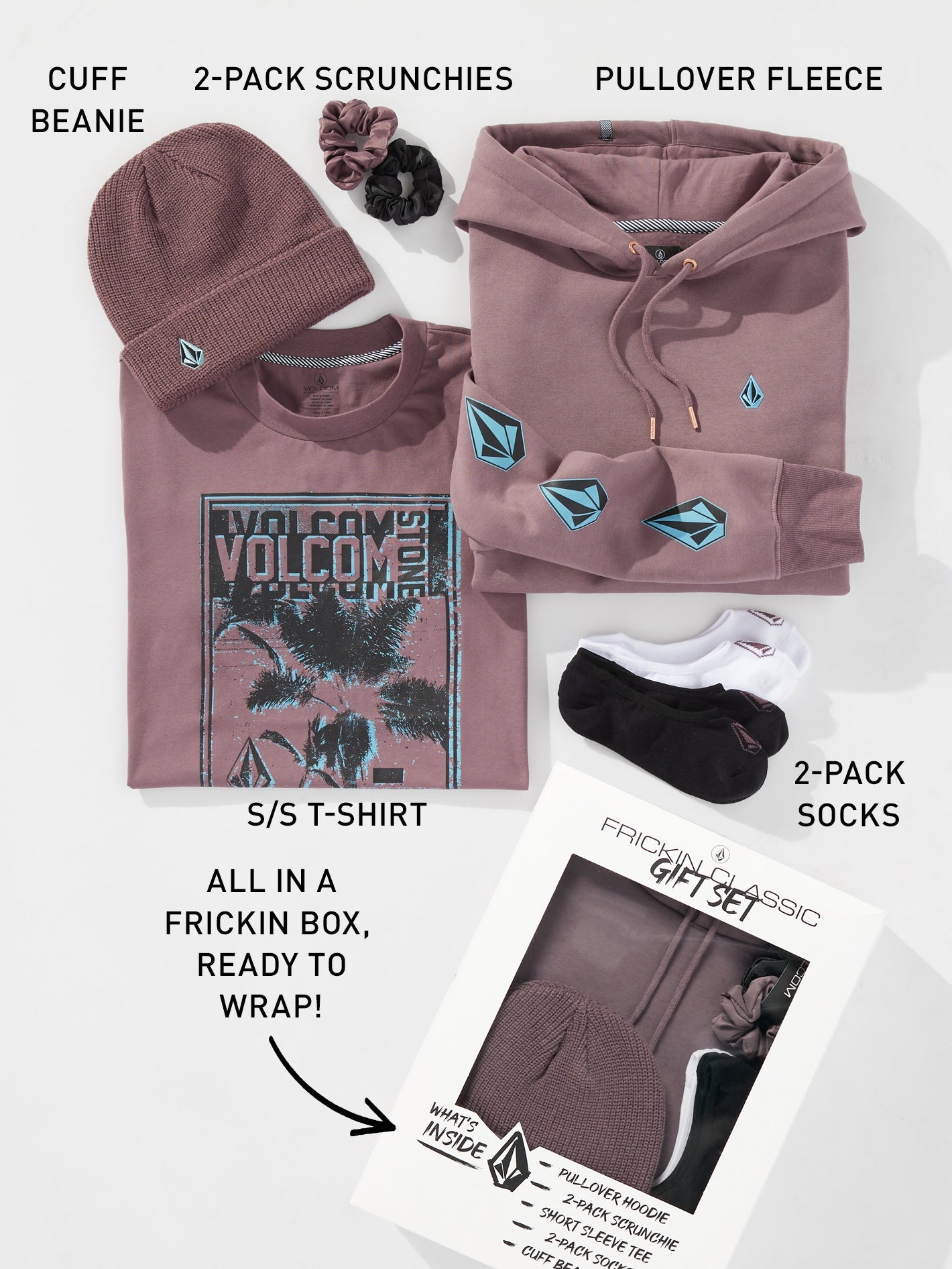 • Gift set containing: pullover fleece, t-shirt, beanie, socks, and scrunchie