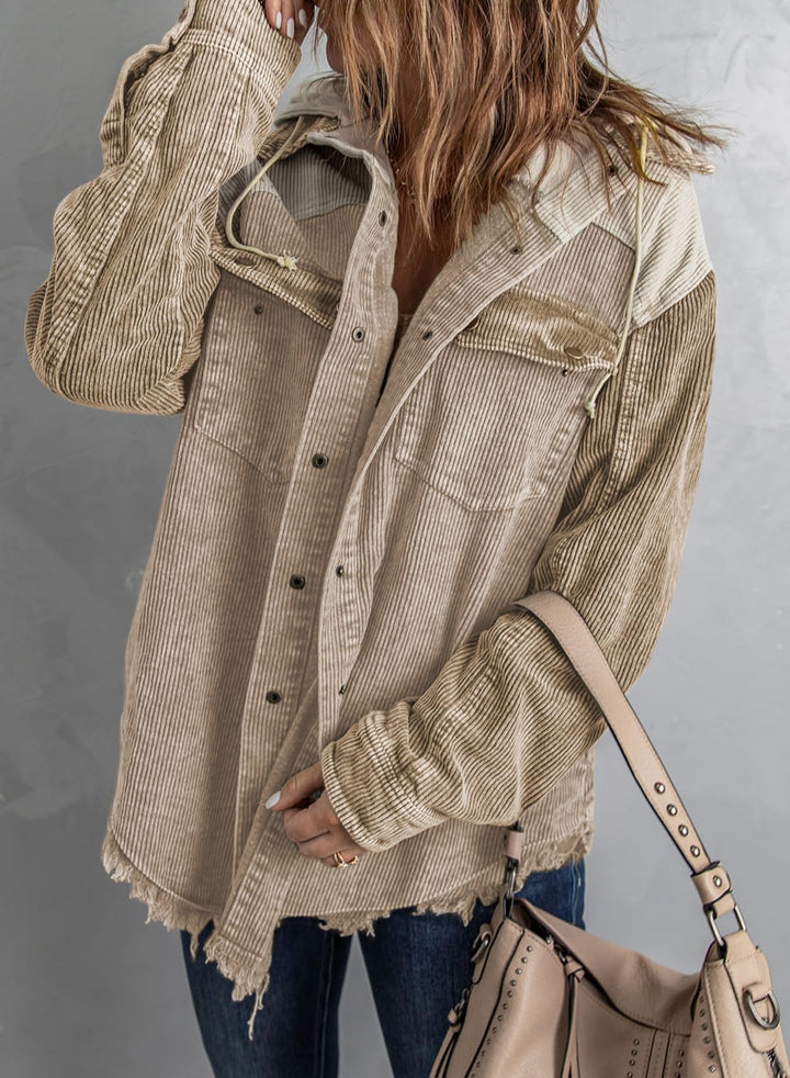 Add a relaxed vibe to your outfits with our Drawstring Pockets Corduroy Shacket. Featuring a hooded design and dropped shoulders, you'll love the casual look of this corduroy shirt. The winter fall coat is made of corduroy material to provide comfort and softness, meeting wearing need in cold days.Fashion color block detail makes the casual jacket stylish, which shows off your taste.