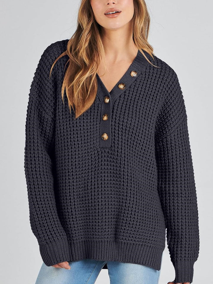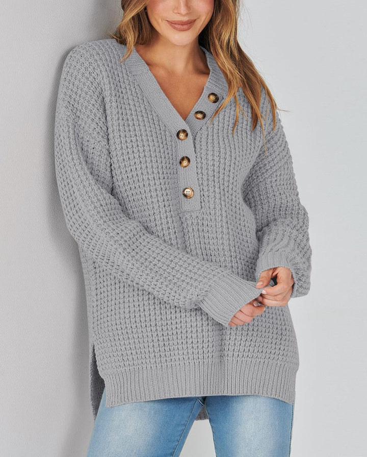 Elevate your winter wardrobe with our exquisite Waffle Side Slit Knit Sweater. Crafted with utmost precision, this pullover exudes effortless style. The classic V-neck design adds a touch of sophistication, while the side slits provide a contemporary twist.